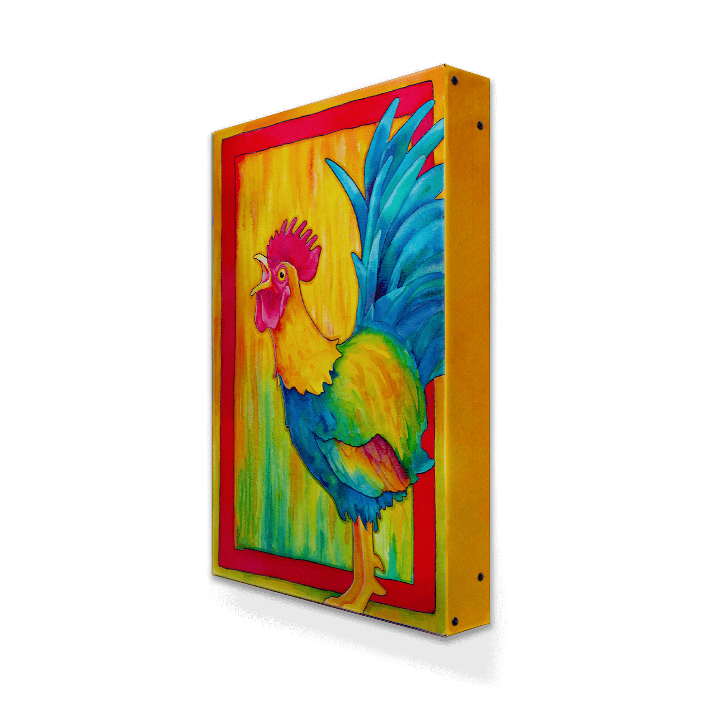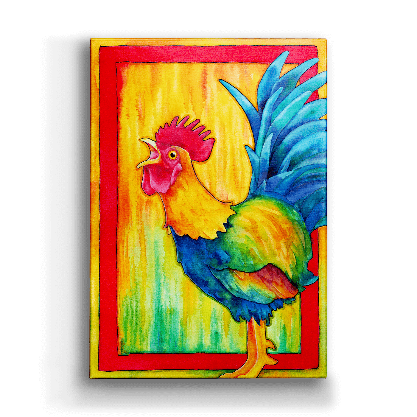 Bursting with fiery reds, sunny yellows, and cool blues, this piece radiates the energy and enthusiasm of a rooster greeting the day with a bold crow. The dynamic background enhances the rooster’s confident stance, making it perfect for anyone who loves farm life or wants to add a touch of spirited charm to their space. Ideal for brightening up kitchens, living rooms, or any area in need of a splash of color and personality, this artwork celebrates the joy of a new day.