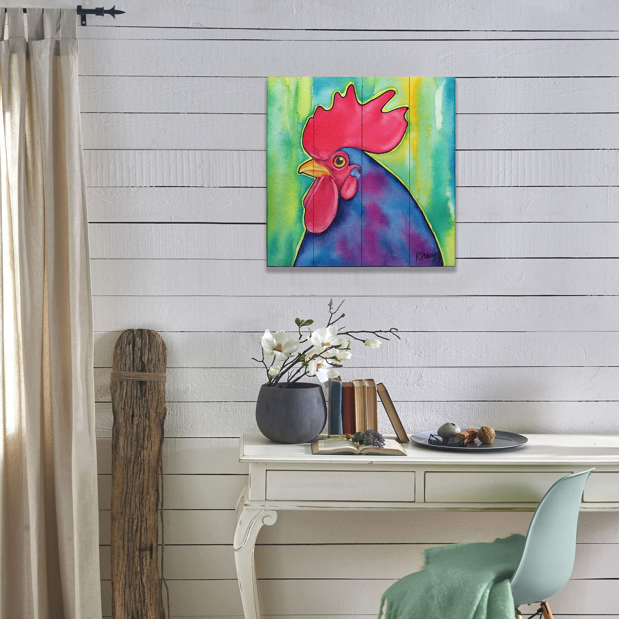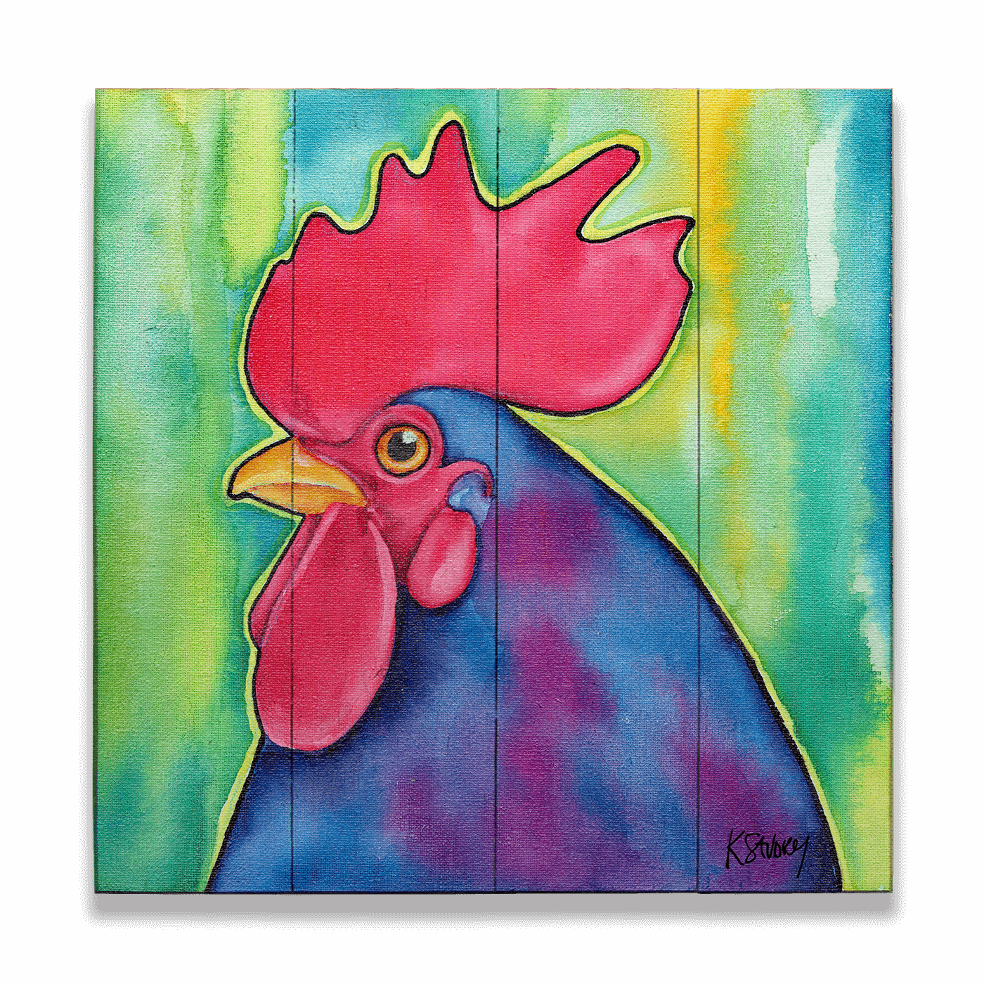 Make a bold statement with this vibrant rooster artwork. Bursting with rich colors, from the striking red comb to the deep blue and purple feathers, this piece brings bright energy and personality to any space. Perfect for adding a touch of farmhouse charm with a modern twist, it’s an eye-catching addition for animal lovers and art enthusiasts alike.