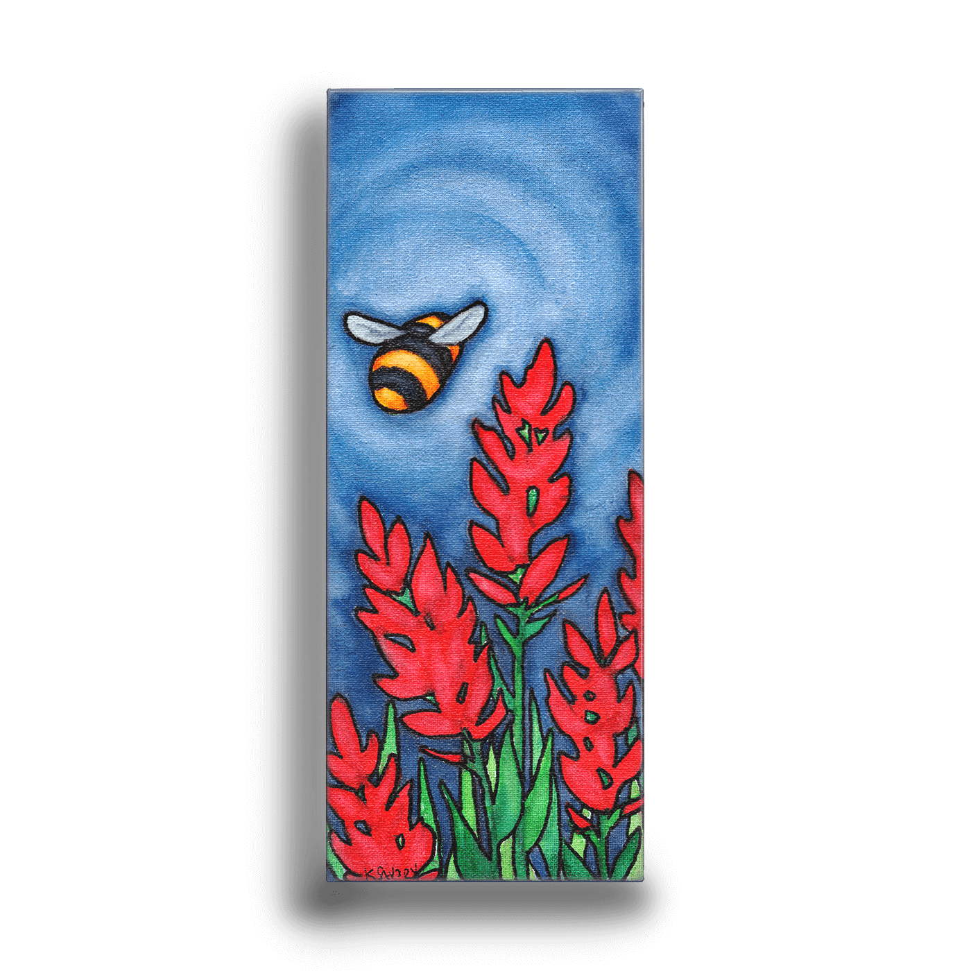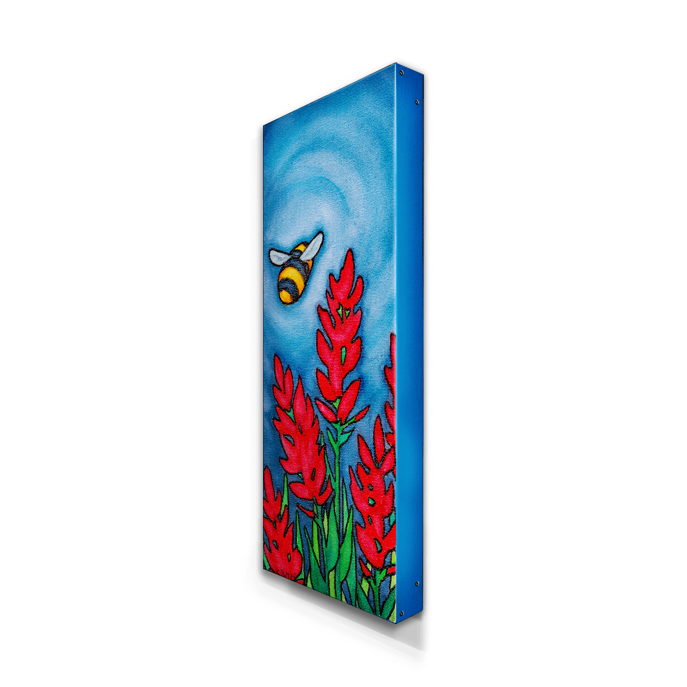 Elevate your decor with this charming artwork showcasing a buzzing bee hovering near vibrant red wildflowers against a swirling blue sky. The bold colors and dynamic movement bring energy and joy to this nature-inspired piece, celebrating the vital relationship between pollinators and blooms. Perfect for creating a cheerful and lively atmosphere, this art adds a touch of whimsy and harmony to any space.