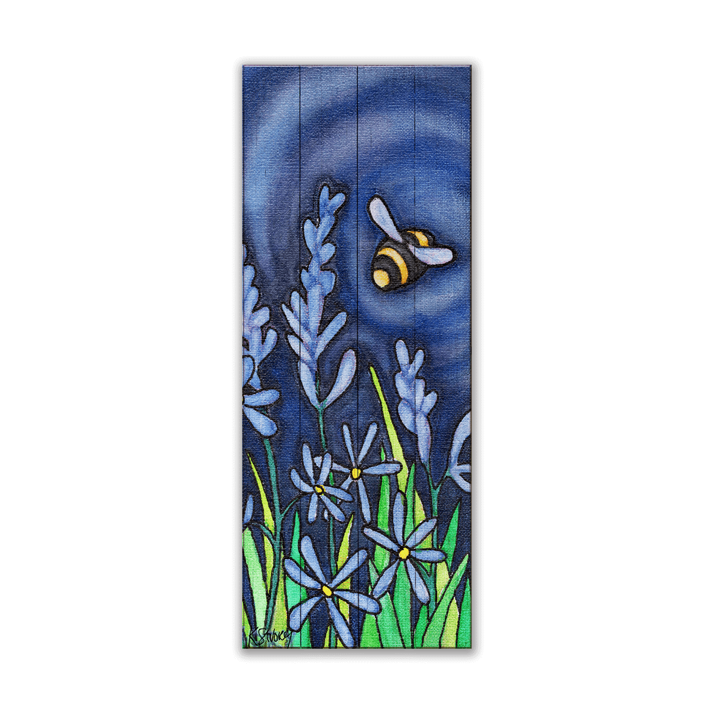 Discover the charm of this enchanting artwork featuring a busy bee in flight among delicate lavender stems and soft blue wildflowers. Set against a mesmerizing swirling sky, this piece captures the peaceful yet dynamic beauty of nature. Perfect for creating a calming and uplifting atmosphere, this art celebrates the simple elegance of pollinators and blooms in harmony.