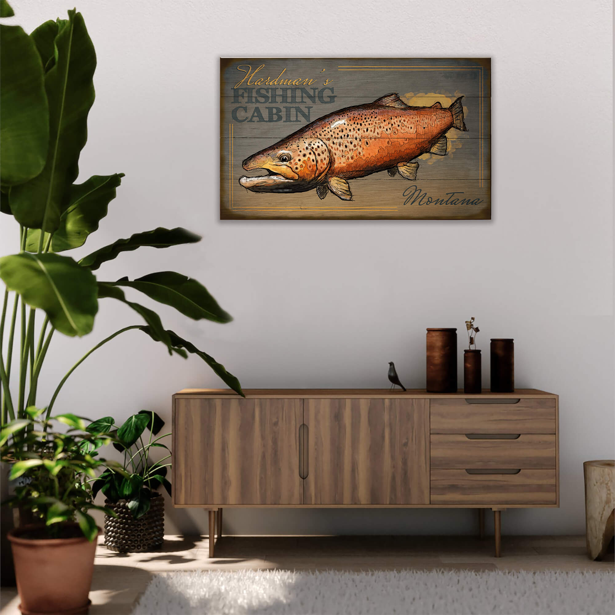 Enhance your decor with this striking artwork, perfect for any fishing enthusiast or lover of the great outdoors. This piece showcases a beautifully detailed illustration of a brown trout, masterfully rendered to capture its majestic form and vibrant colors. Ideal for adding a touch of rustic elegance to any room, this artwork brings the spirit of adventure and the thrill of the catch into your home or cabin.