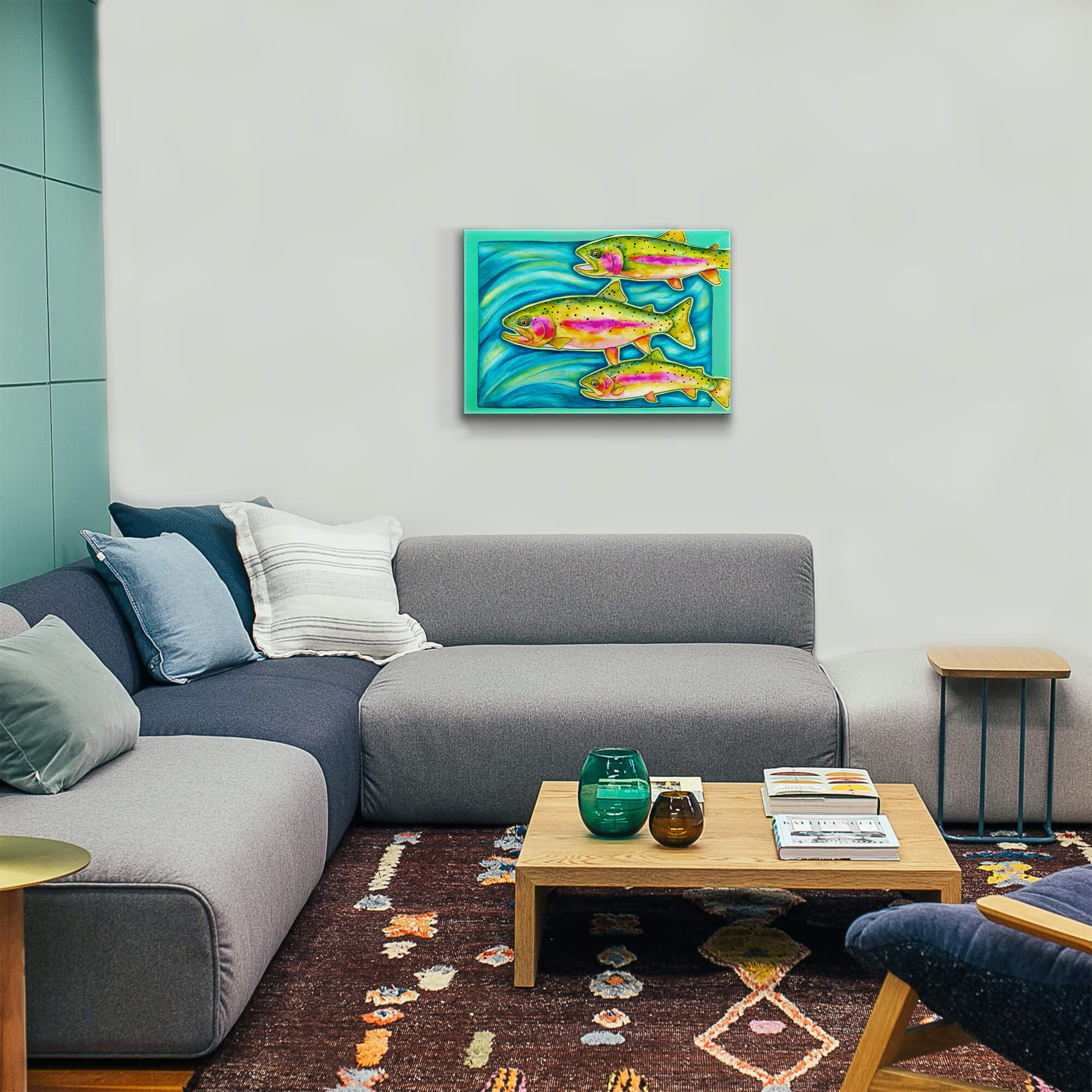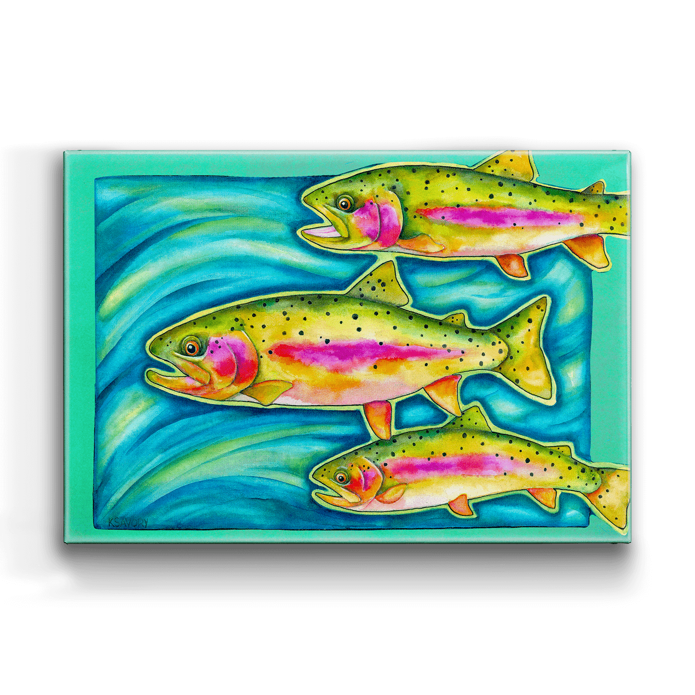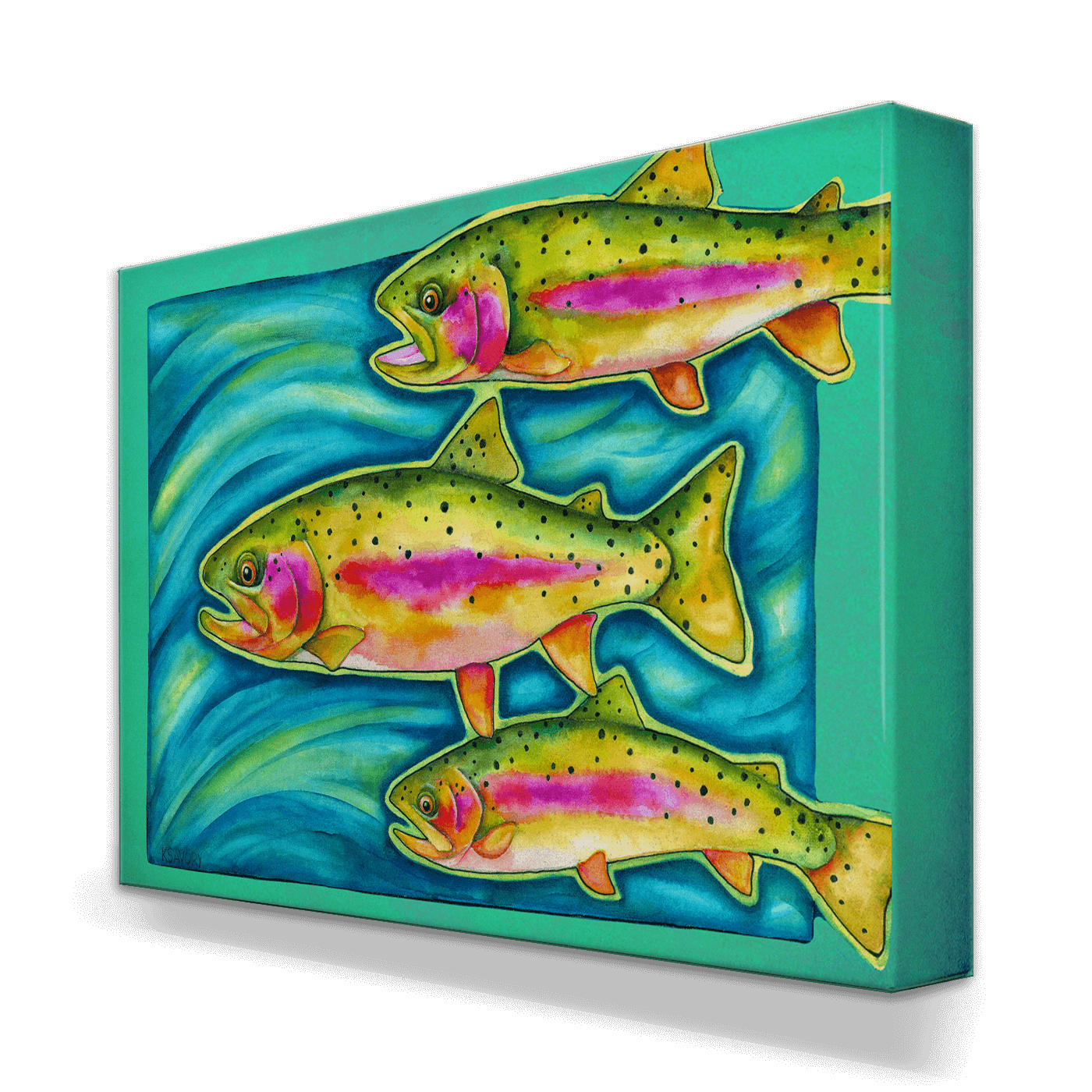 Dive into the vibrant world of water with this stunning artwork featuring a trio of colorful trout swimming gracefully through shimmering blue water. The fish are brought to life with vivid hues of green, pink, and gold, capturing their natural beauty and movement. This piece is perfect for nature enthusiasts, anglers, or anyone who appreciates aquatic art. Its lively colors and dynamic composition make it an eye-catching addition to any space, adding a touch of underwater serenity and charm.