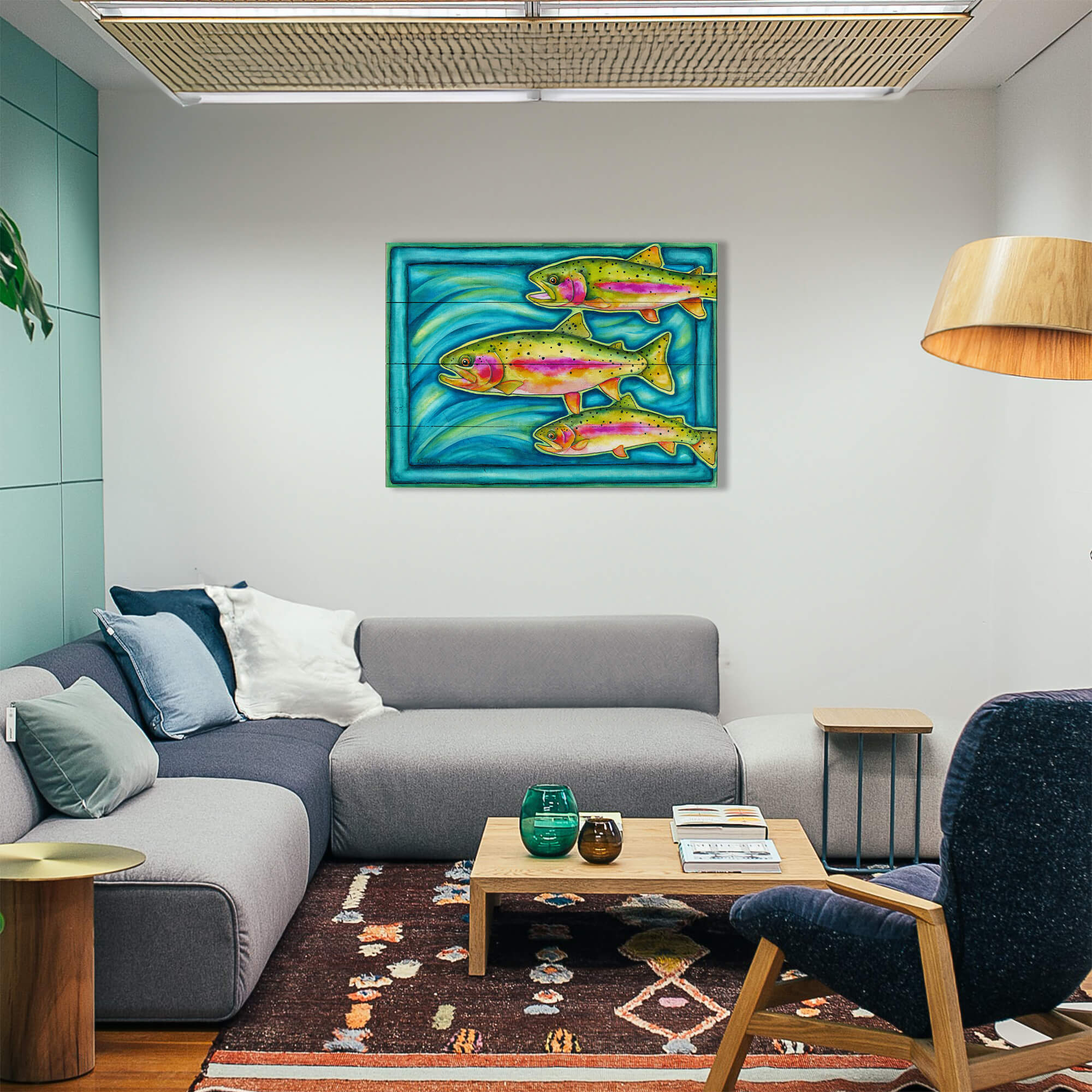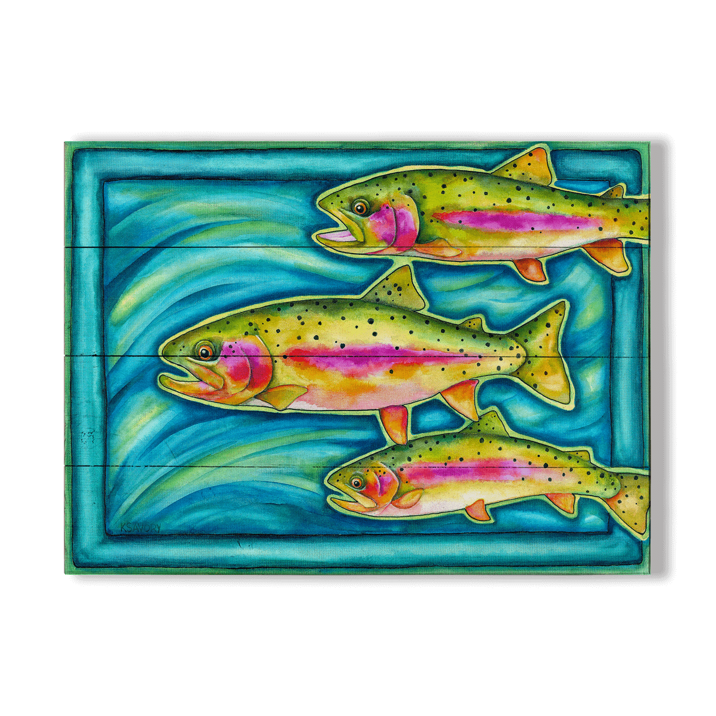 Dive into the vibrant world of water with this stunning artwork featuring a trio of colorful trout swimming gracefully through shimmering blue water. The fish are brought to life with vivid hues of green, pink, and gold, capturing their natural beauty and movement. This piece is perfect for nature enthusiasts, anglers, or anyone who appreciates aquatic art. Its lively colors and dynamic composition make it an eye-catching addition to any space, adding a touch of underwater serenity and charm.