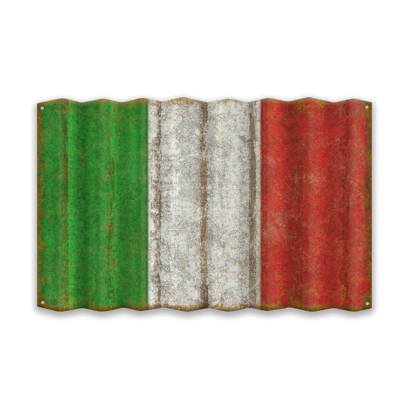 This artwork presents the Italian flag on a time-worn corrugated metal surface, offering a distinctive, antique aesthetic. The vibrant bands of green, white, and red encapsulate Italy's national pride while exuding a historical and vintage vibe. The rustic texture and weathering on the metal add layers of depth and character, making this piece not only a symbol of national identity but also a tribute to history and endurance.