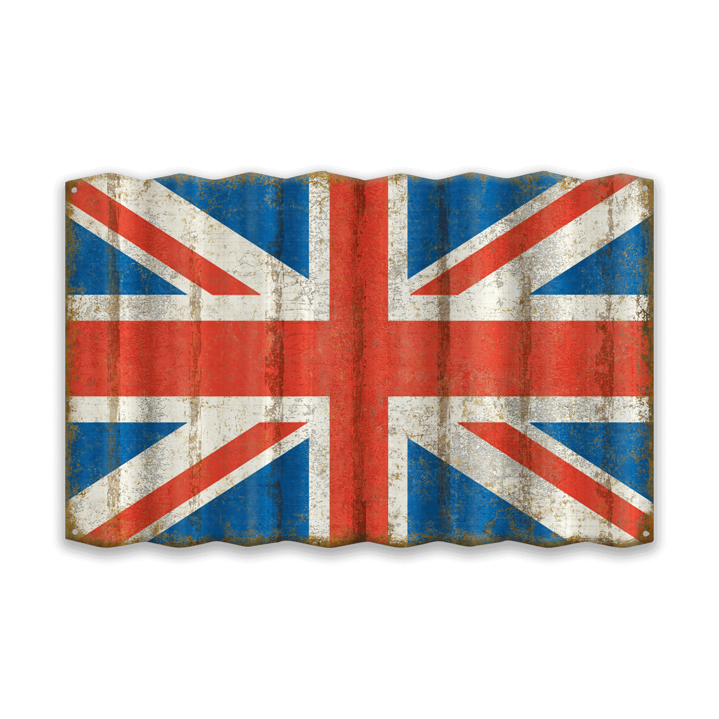This captivating artwork features a vintage rendition of the Union Jack, the national flag of the United Kingdom, displayed on a corrugated metal sign. The flag's iconic design, with its bold red, white, and blue colors, is overlaid with a distressed look that gives it a rugged, historical appeal. Perfect for those who appreciate both national pride and a touch of antique charm, this piece brings a slice of British heritage to any space. Ideal for adding character to home or office decor.