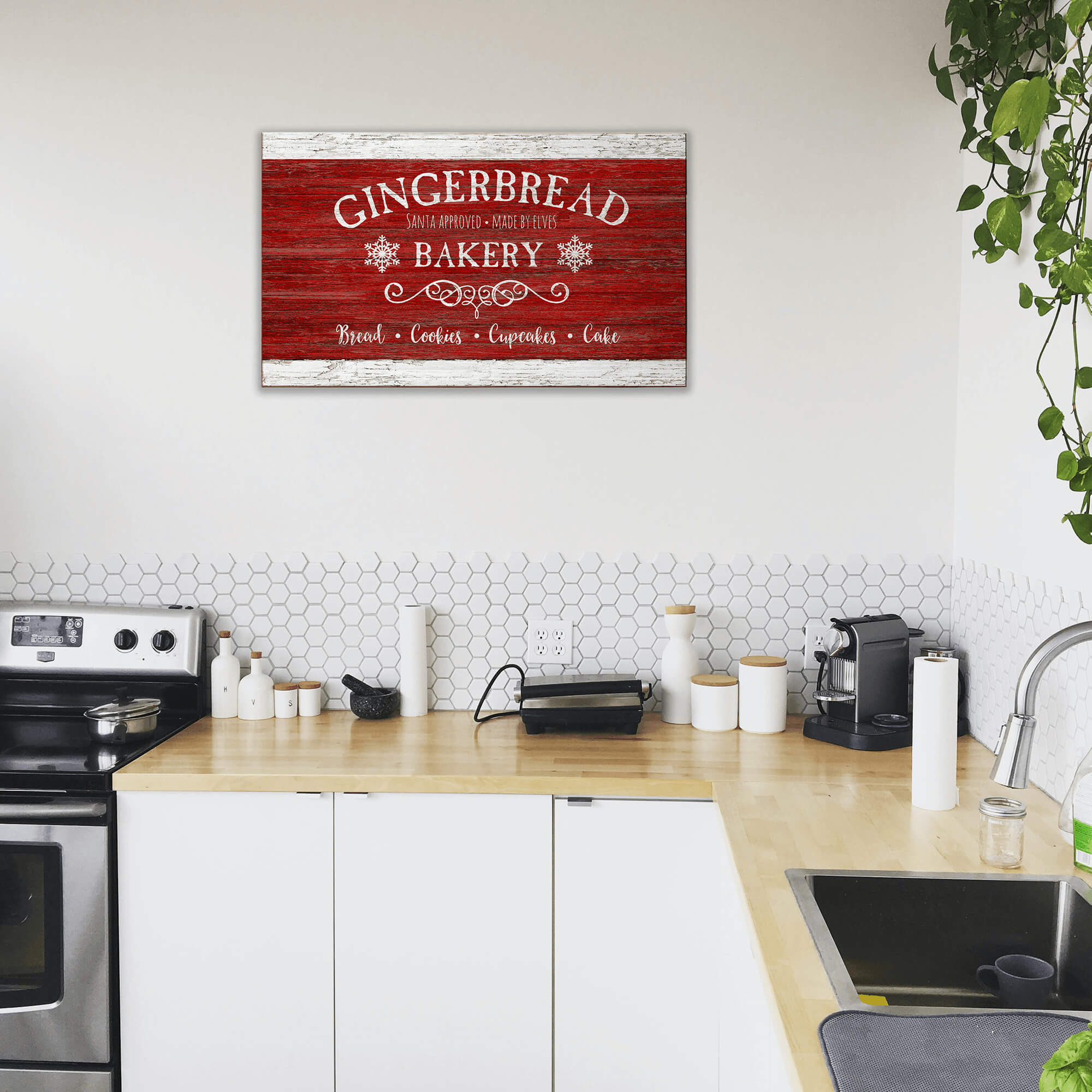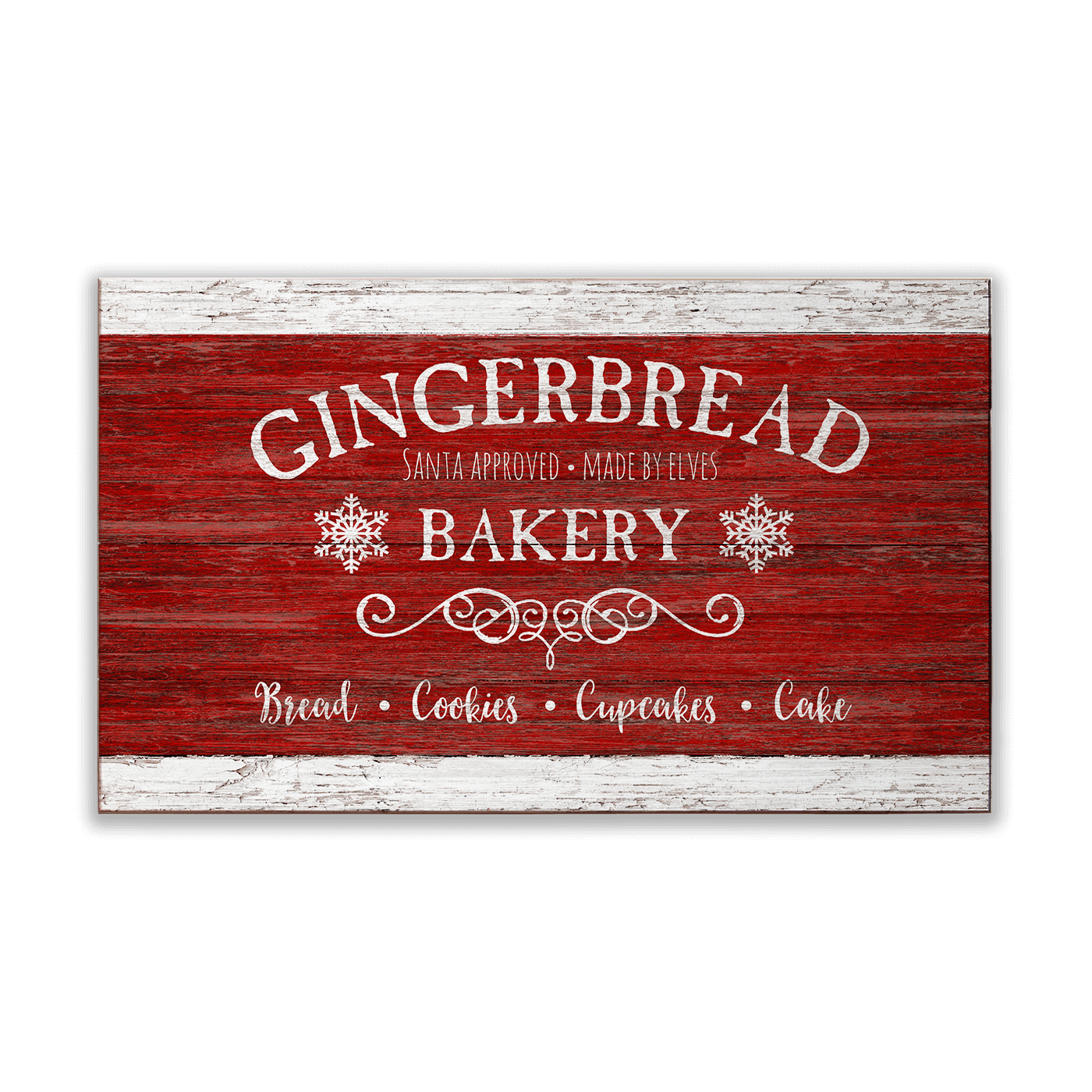 This delightful holiday artwork features a rustic "Gingerbread Bakery" sign, perfect for adding a cozy, festive touch to your Christmas decor. With its classic red textured background and whimsical details like snowflakes and elegant script, the sign evokes the charm of a nostalgic holiday bakery. The playful "Santa Approved, Made by Elves" tagline adds a fun, magical element, making it ideal for creating a warm and inviting atmosphere during the holiday season. Perfect for those who love baking-themed or vintage-style Christmas decorations.