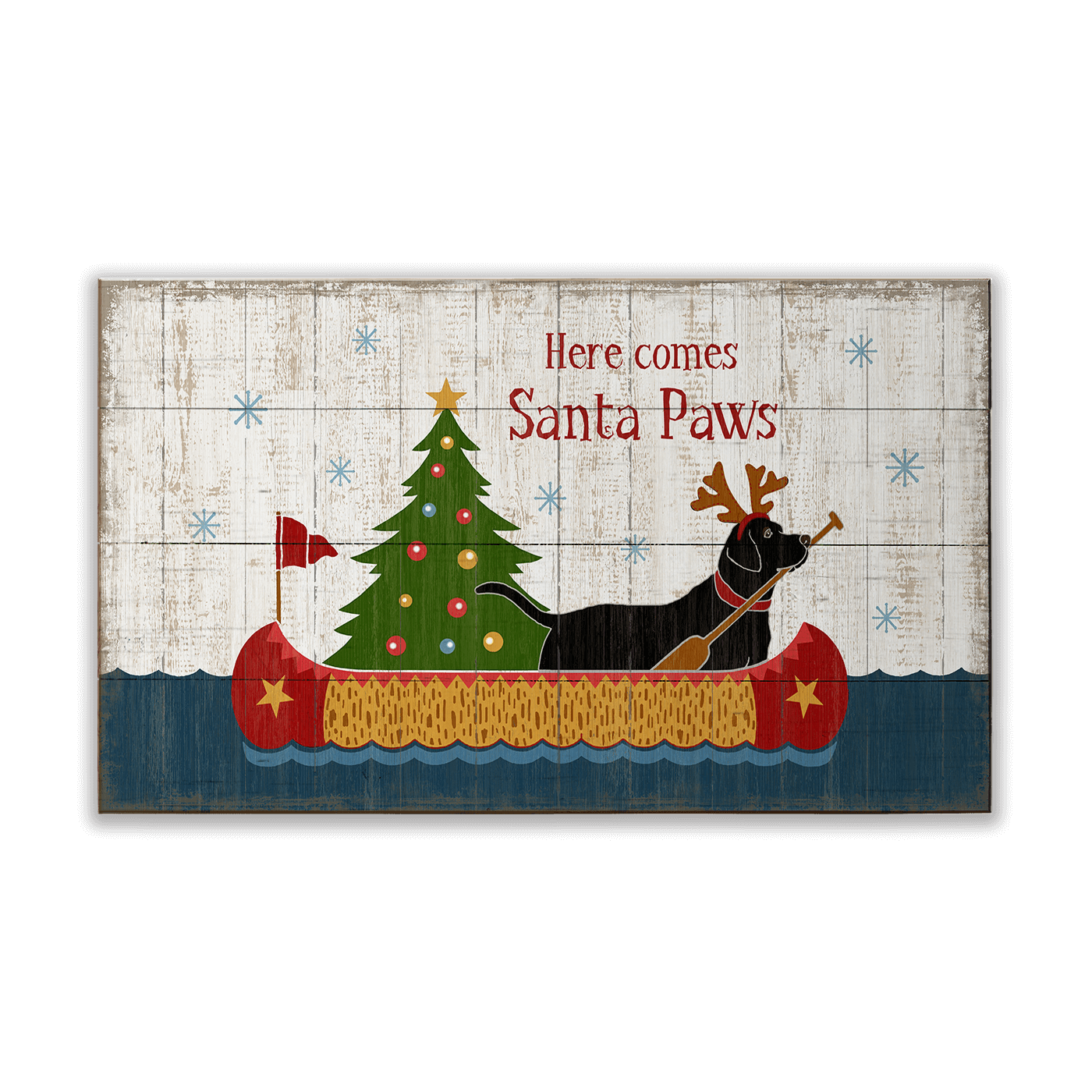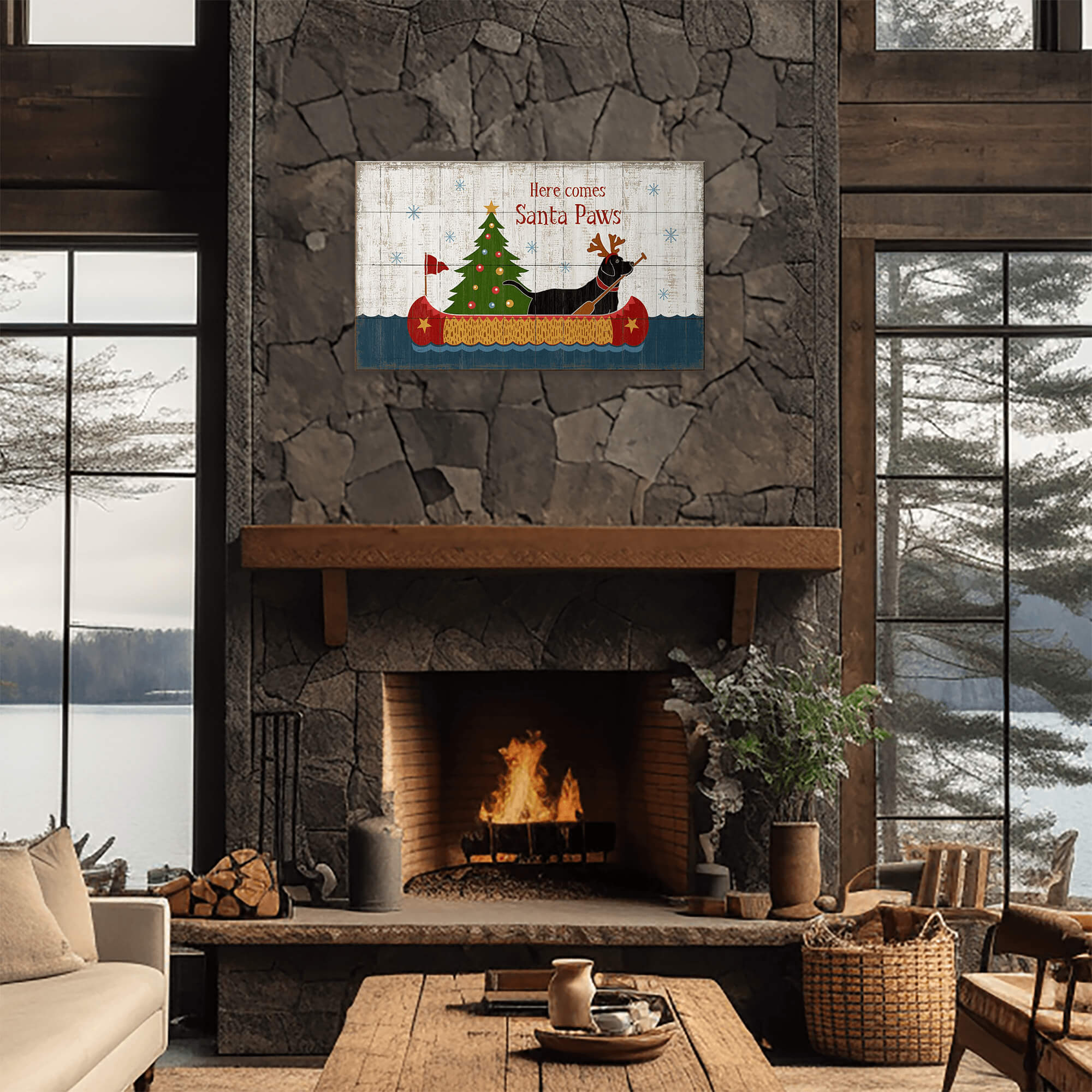 This charming holiday artwork features a playful dog, dressed in reindeer antlers, paddling a canoe adorned with a festive Christmas tree. The phrase "Here Comes Santa Paws" adds a fun and whimsical touch to the rustic, textured background. Perfect for dog lovers and those who enjoy adding a lighthearted, festive spirit to their holiday decor, this piece brings a cozy, cheerful atmosphere to any space. Ideal for creating a warm and welcoming environment during the Christmas season.