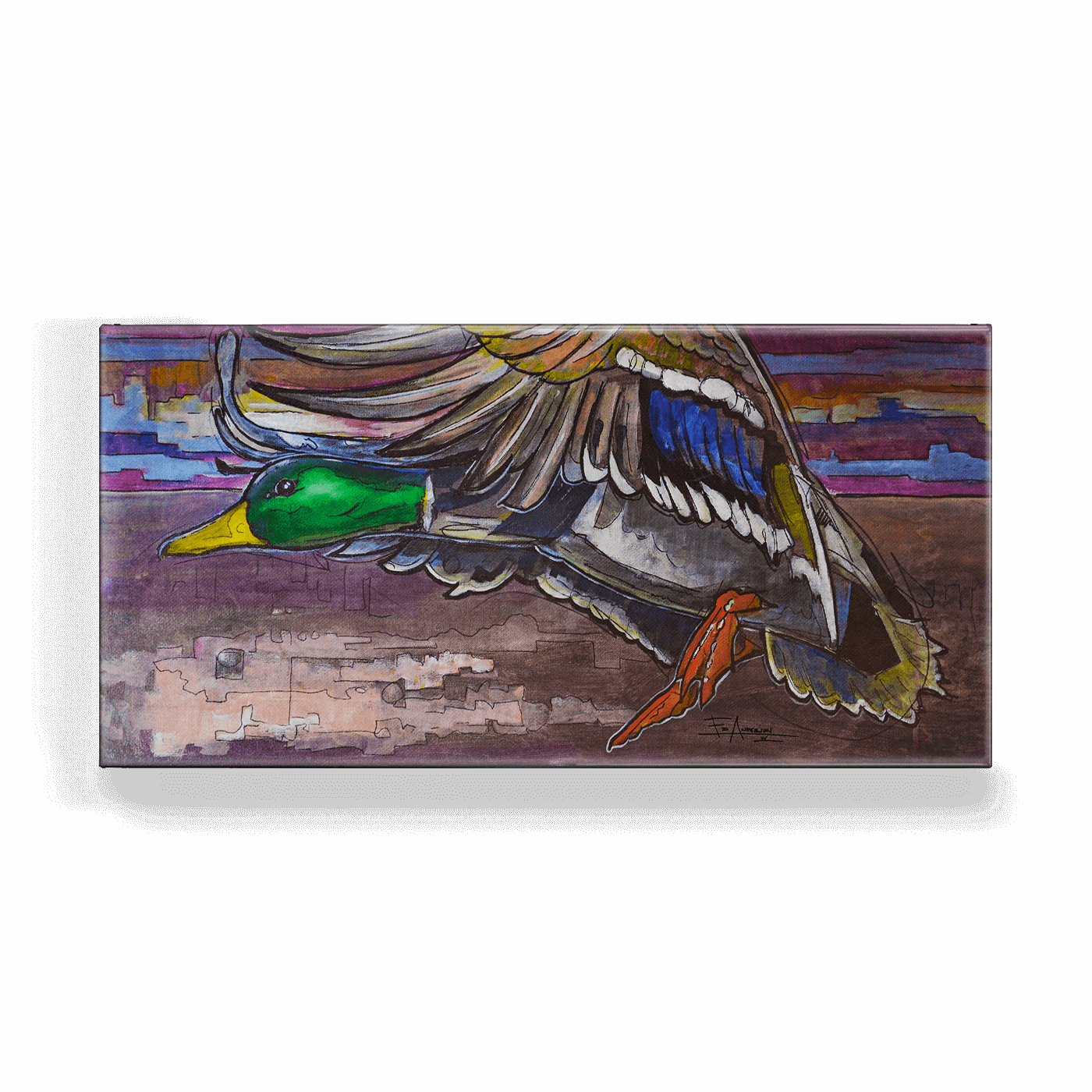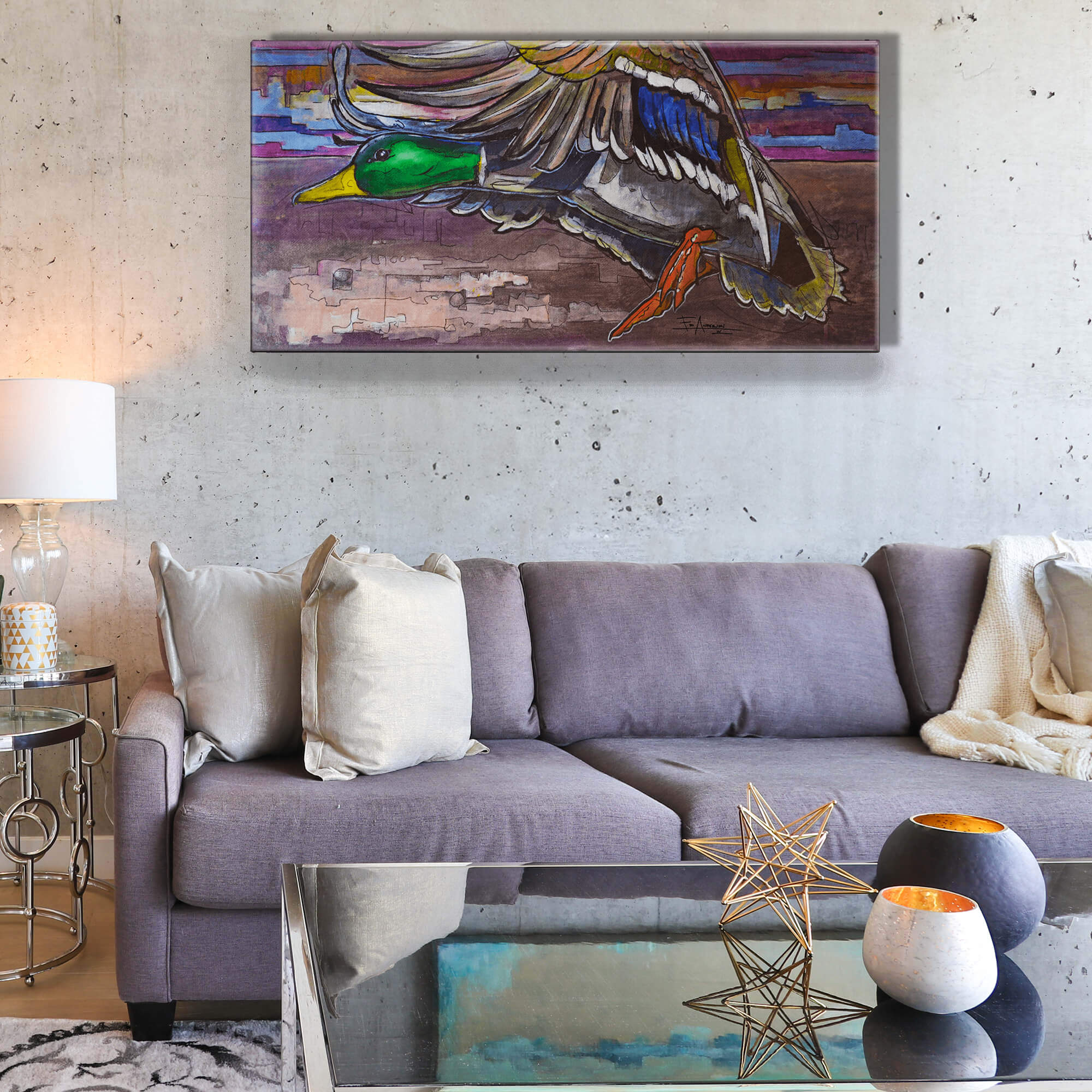 This striking piece of wall art captures the dynamic essence of nature in a vibrant portrayal of a mallard in flight. The vivid colors bring to life the mallard's graceful movement, with each brushstroke adding to the sense of motion and vitality. The background suggests a fusion of natural elements and abstract design, blending earthy tones with bold streaks of color that evoke the hues of a setting sun. This artwork is not just a visual treat; it's a celebration of wildlife, perfect for any space that yearns for a touch of the wild and a splash of color.