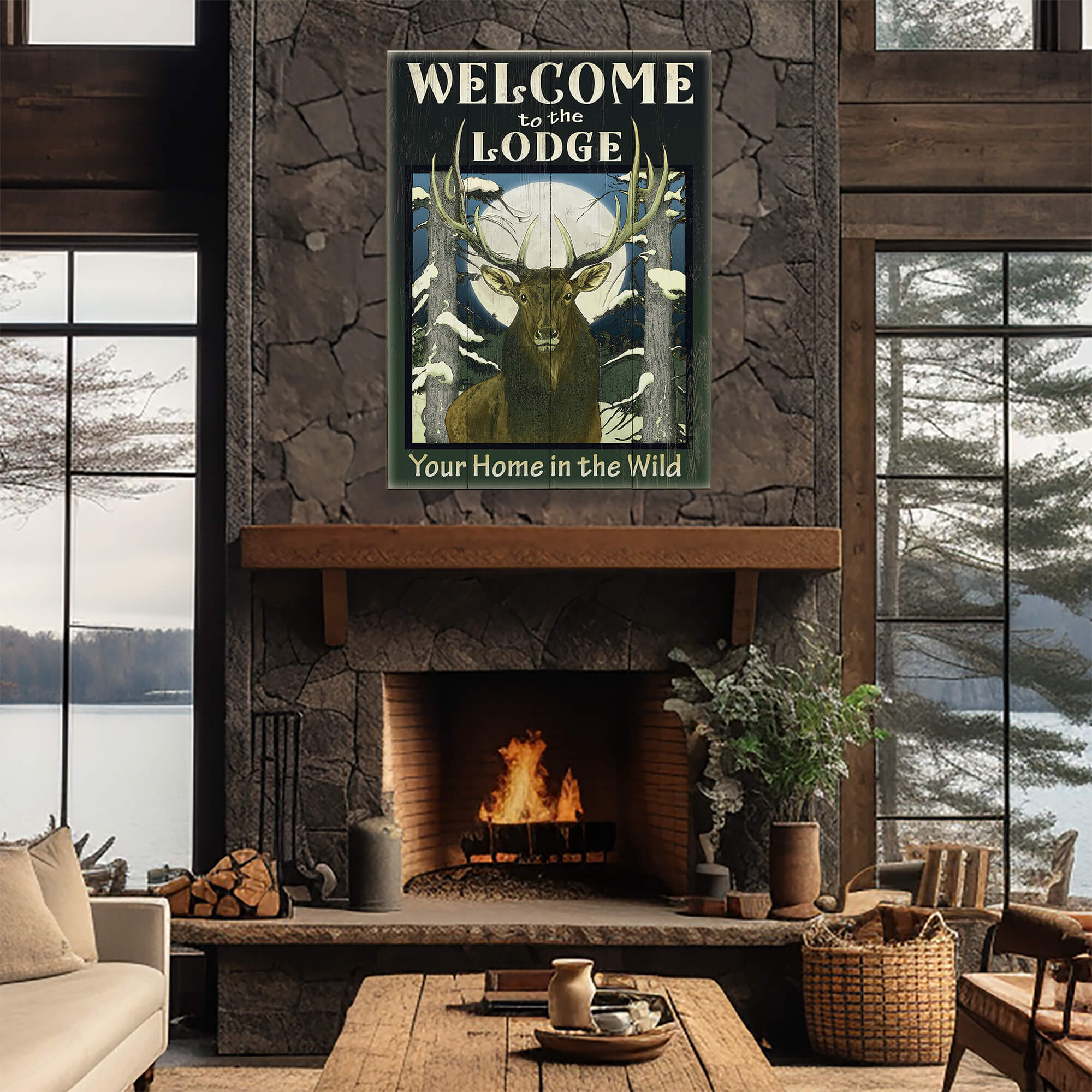 Welcome to rustic charm with 'Welcome to the Lodge' a beautifully crafted artwork that invites warmth and wilderness into your space. This striking piece features a majestic elk set against a moonlit forest backdrop, perfect for enhancing the decor of any lodge, cabin, or nature lover’s retreat. It's an ideal choice for those looking to add a touch of serene wildlife and natural beauty to their home or getaway.