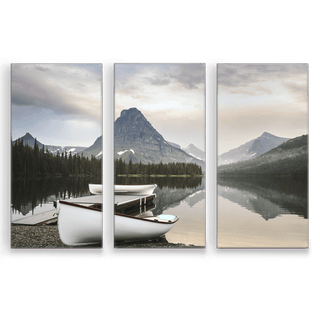 Enjoy the tranquil beauty of Two Medicine Lake with this serene triptych wall art from Glacier National Park. This piece elegantly captures the early morning stillness of the lake, with canoes resting gently on the water's edge, ready for the day's adventures. The majestic peaks of the surrounding mountains are beautifully reflected in the mirror-like surface of the lake, creating a perfect symphony of nature's splendor. Ideal for those who cherish the peaceful moments in the great outdoors, this artwork brings the calming essence of Two Medicine Lake into any living space or office.