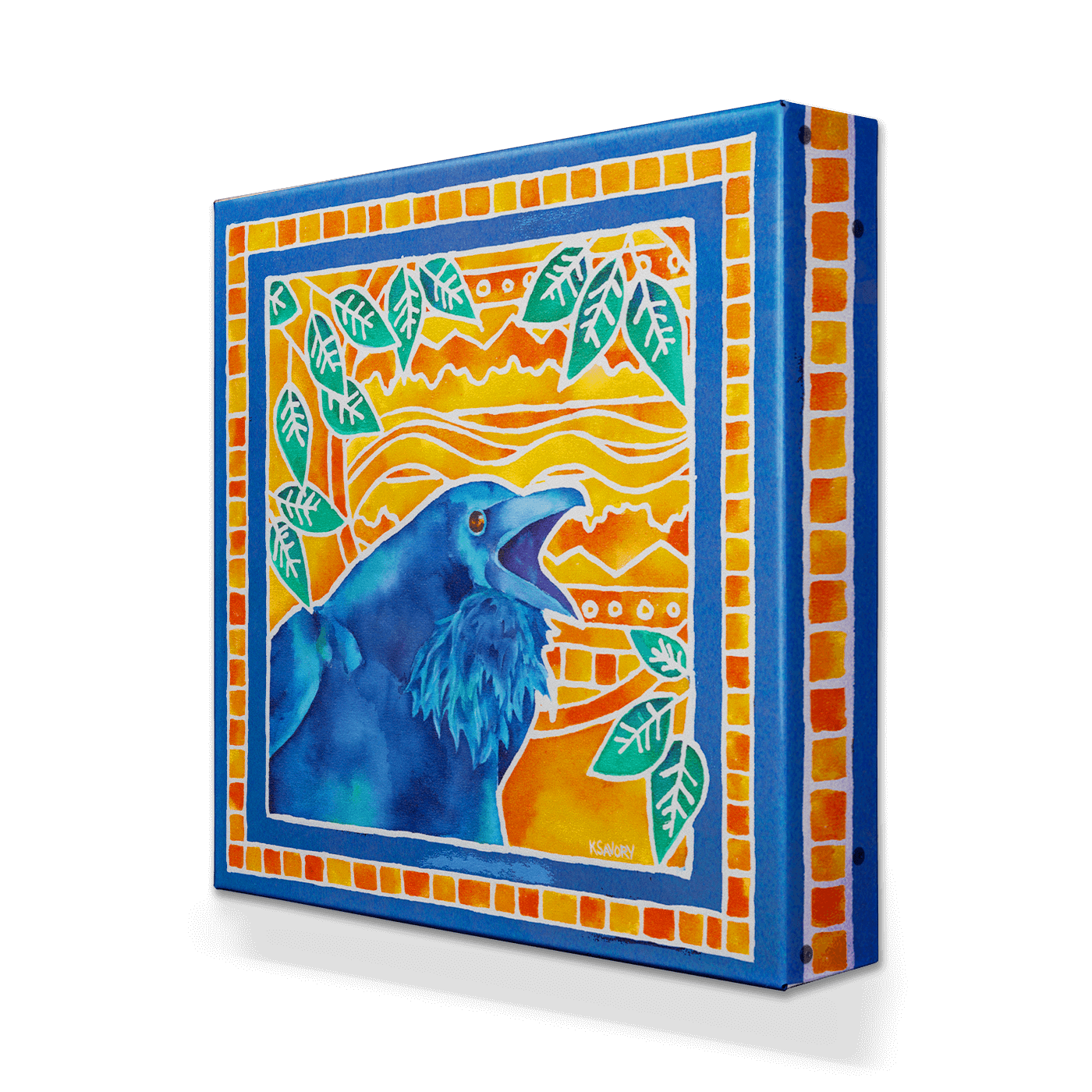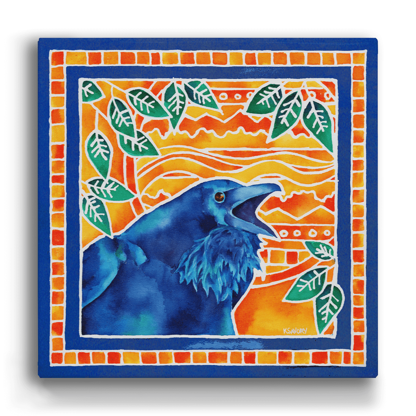 This striking artwork features a blue crow set against a vibrant background of orange and yellow, framed with a bold mosaic border. The expressive and dynamic crow, surrounded by leafy patterns, adds a lively energy to the composition. With its rich colors and intricate details, this piece is perfect for those looking to bring a touch of nature and artistic flair to their space. Ideal for bird enthusiasts and art lovers alike, this captivating design makes a unique and eye-catching statement.