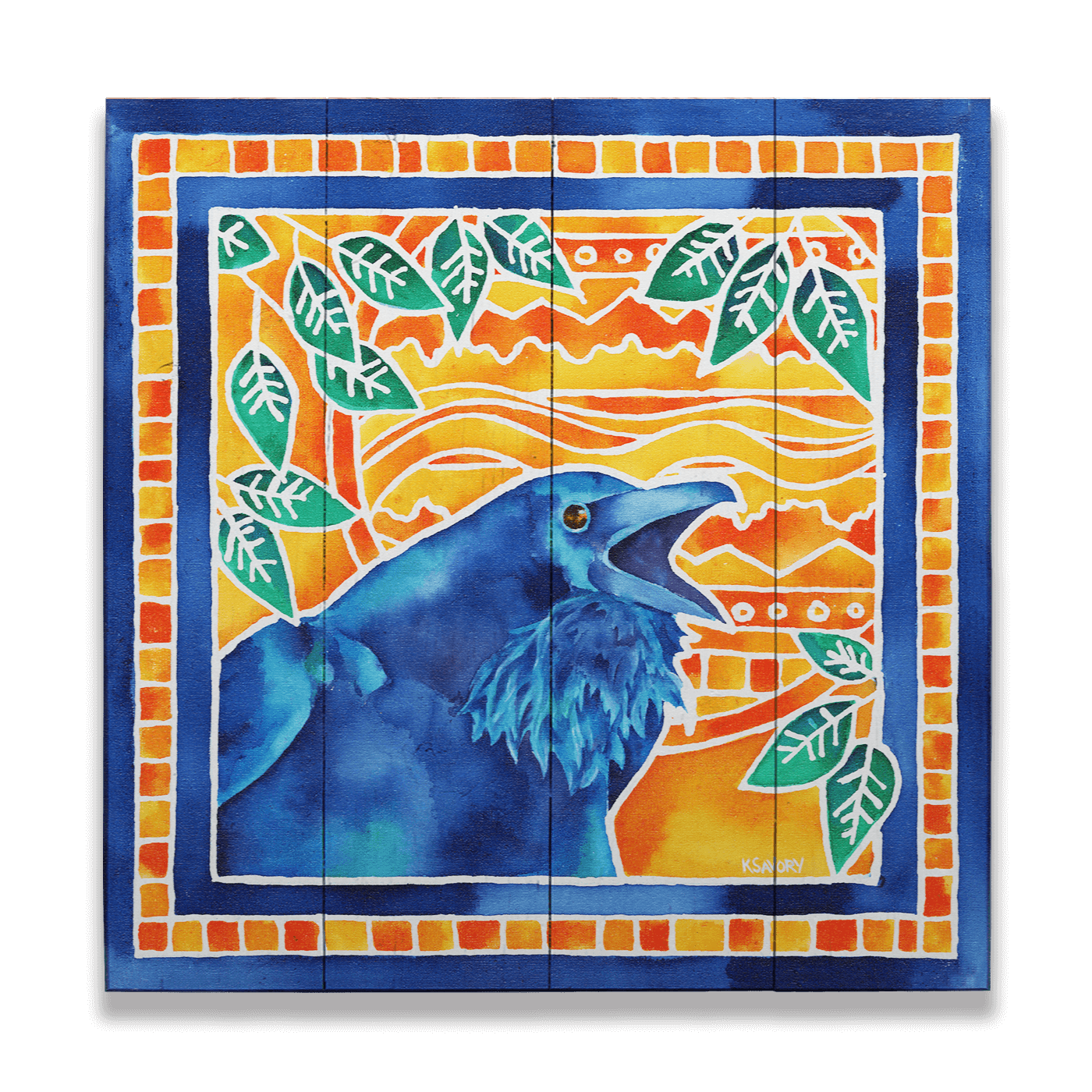 This striking artwork features a blue crow set against a vibrant background of orange and yellow, framed with a bold mosaic border. The expressive and dynamic crow, surrounded by leafy patterns, adds a lively energy to the composition. With its rich colors and intricate details, this piece is perfect for those looking to bring a touch of nature and artistic flair to their space. Ideal for bird enthusiasts and art lovers alike, this captivating design makes a unique and eye-catching statement.
