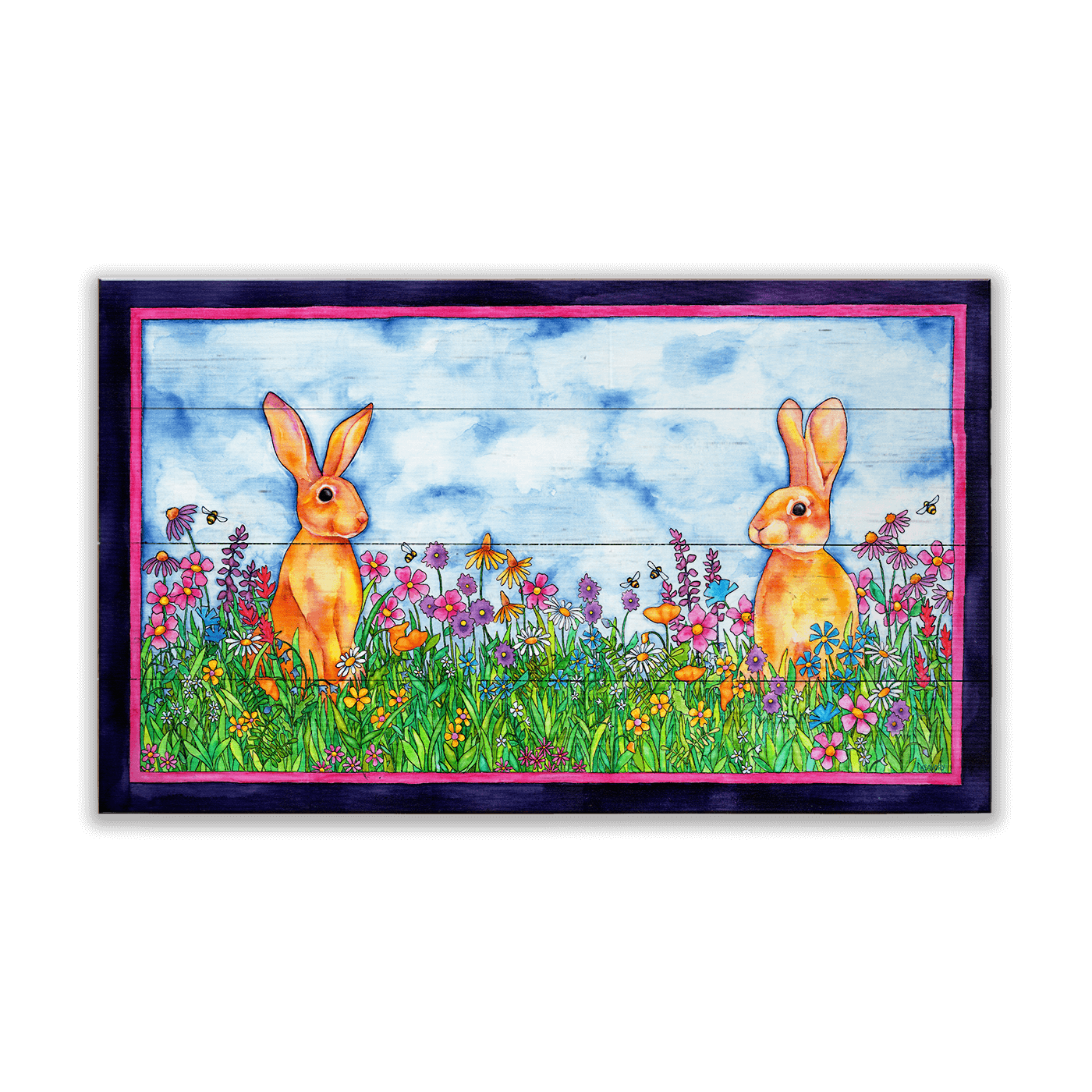 Step into a whimsical spring meadow with this vibrant artwork showcasing two golden-hued rabbits nestled amidst a kaleidoscope of wildflowers. The playful buzz of bees and colorful floral details create a lively, enchanting scene. Perfect for adding a splash of nature-inspired charm to your space, this captivating piece radiates warmth, joy, and the boundless beauty of the outdoors.