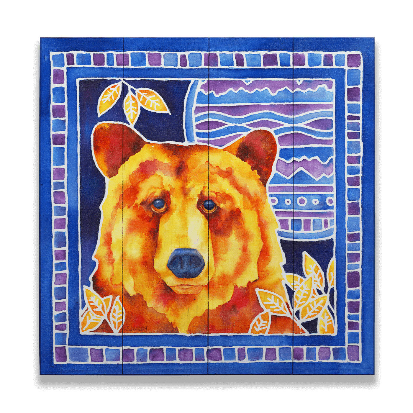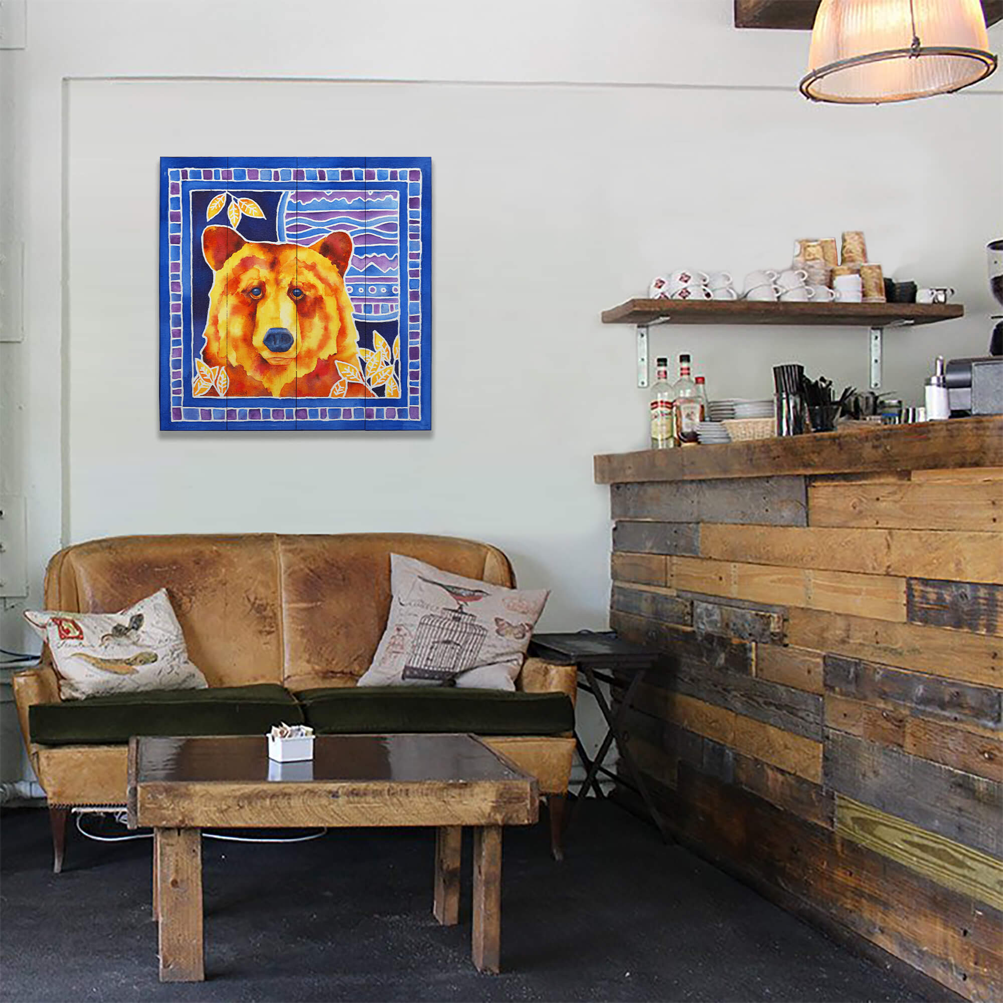 Bring the spirit of the wild into your space with this stunning bear artwork. Featuring warm, fiery hues against a vibrant blue and purple mosaic border, this piece captures the bear’s majestic gaze and earthy charm. Perfect for nature lovers looking to add a bold, artistic touch to their decor, this captivating design will make a striking statement on any wall.