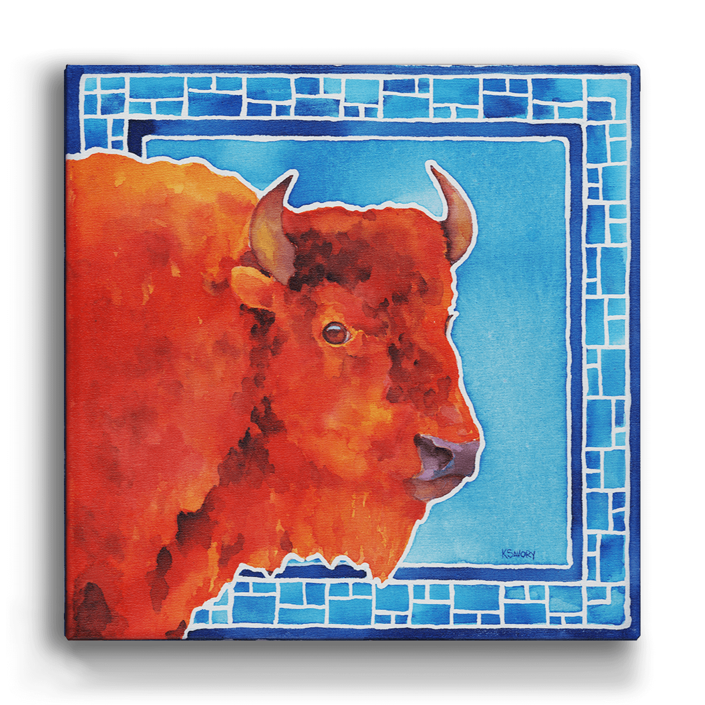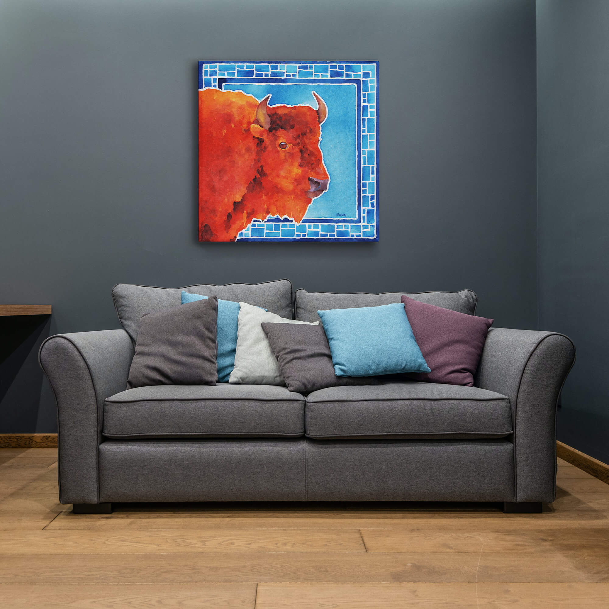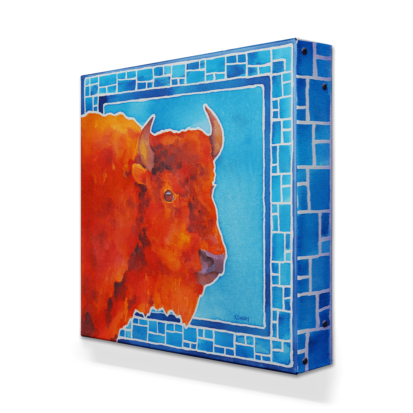 Bring the majesty of the prairie into your home with this striking bison artwork! Featuring rich, warm tones against a cool blue mosaic border, this piece captures the bison’s powerful presence and natural beauty. Perfect for adding a bold touch of wilderness to any space, it’s ideal for nature enthusiasts and art lovers alike.