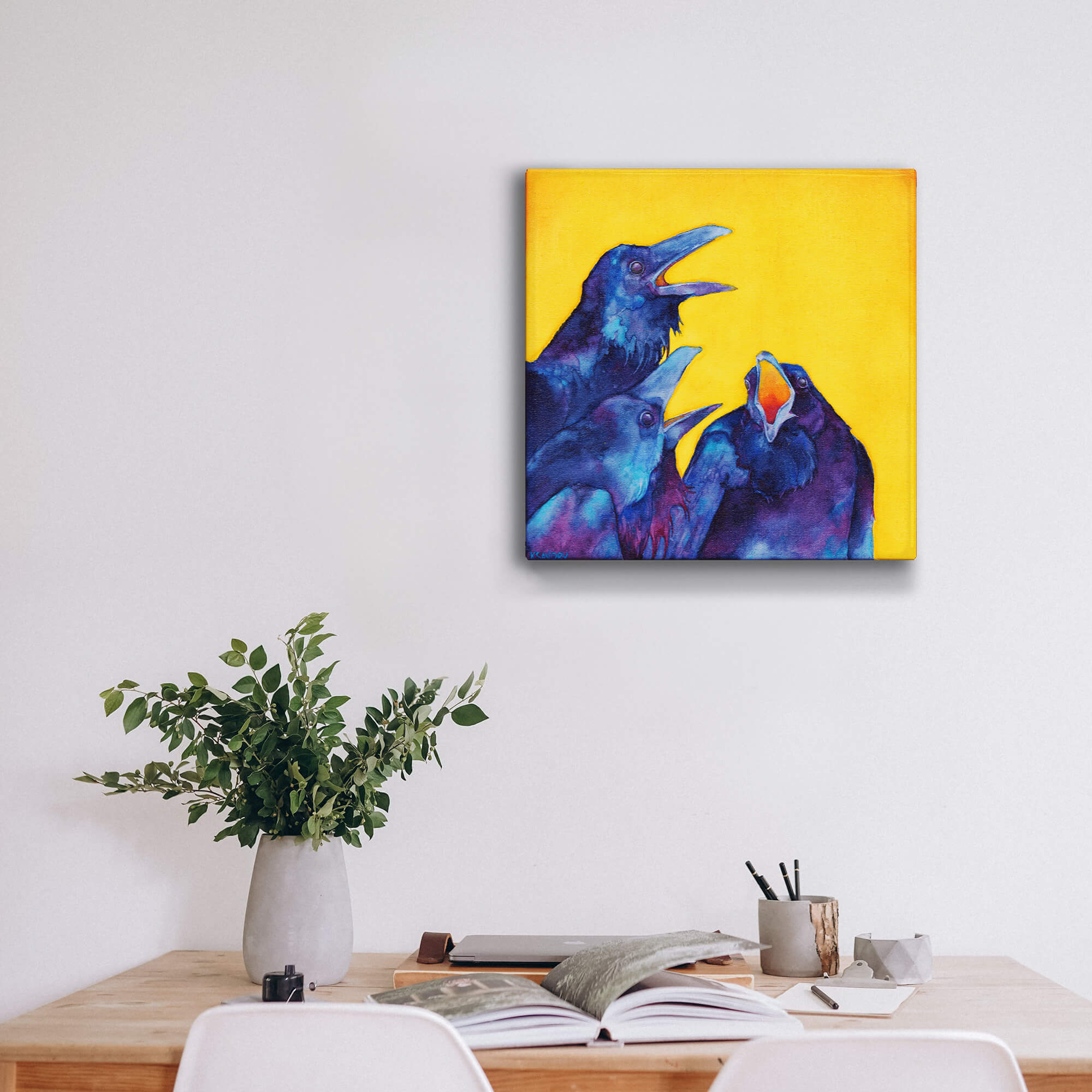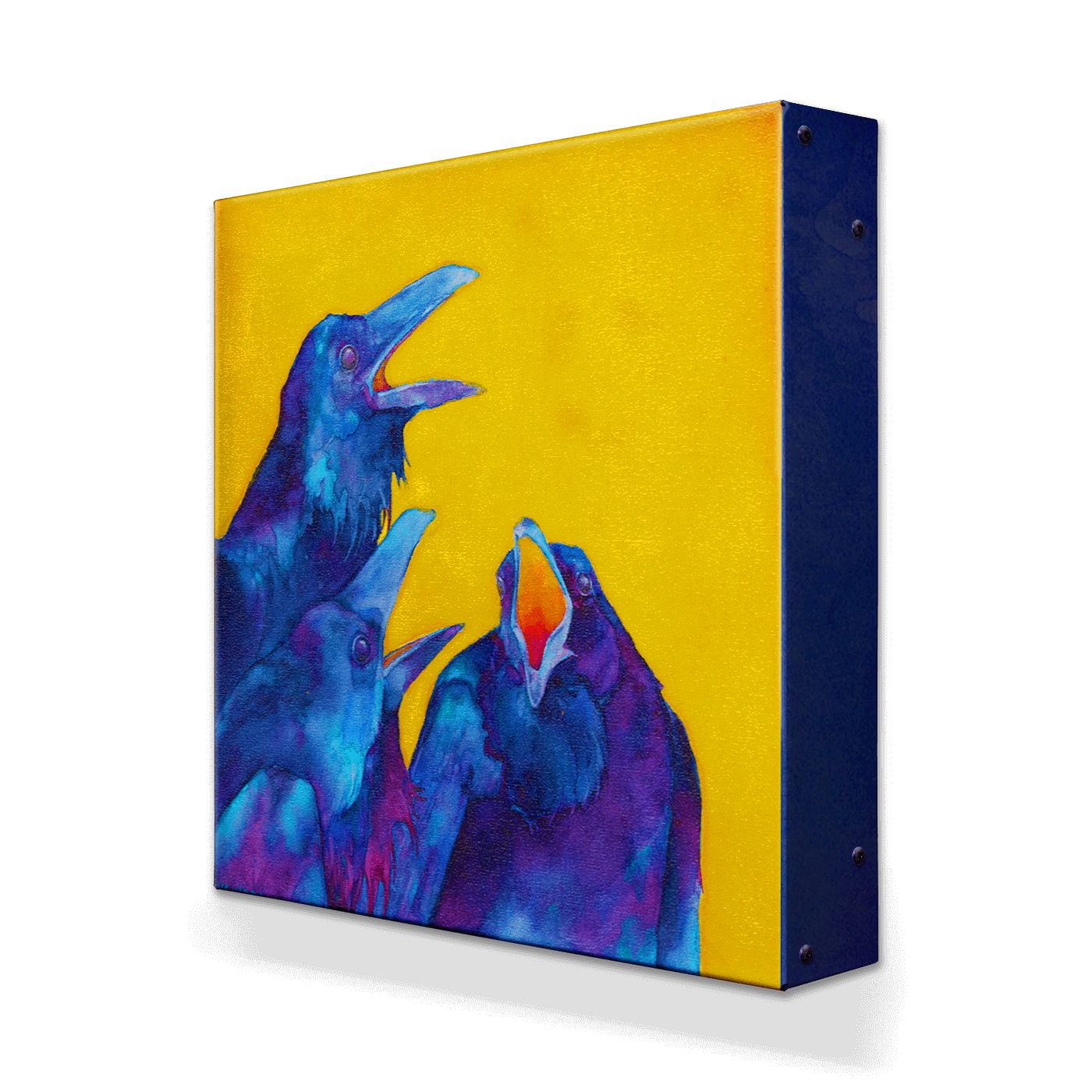 This expressive artwork features a group of vibrant ravens set against a bold yellow background. The rich blues and purples of the birds create a striking contrast, capturing their lively personalities and interactions. Ideal for bird and wildlife enthusiasts, this piece brings energy and character to any space, celebrating the beauty and mystery of these intelligent creatures.