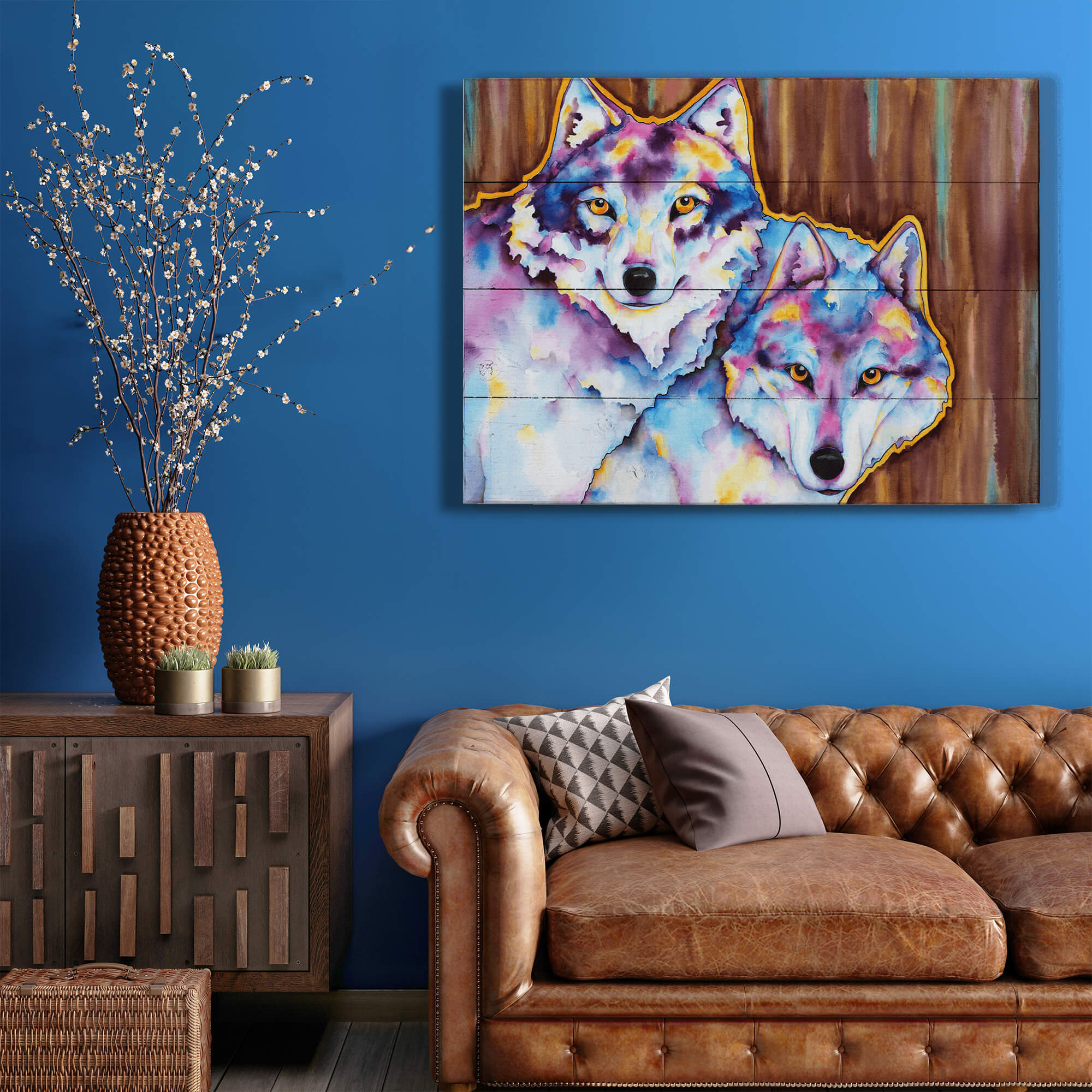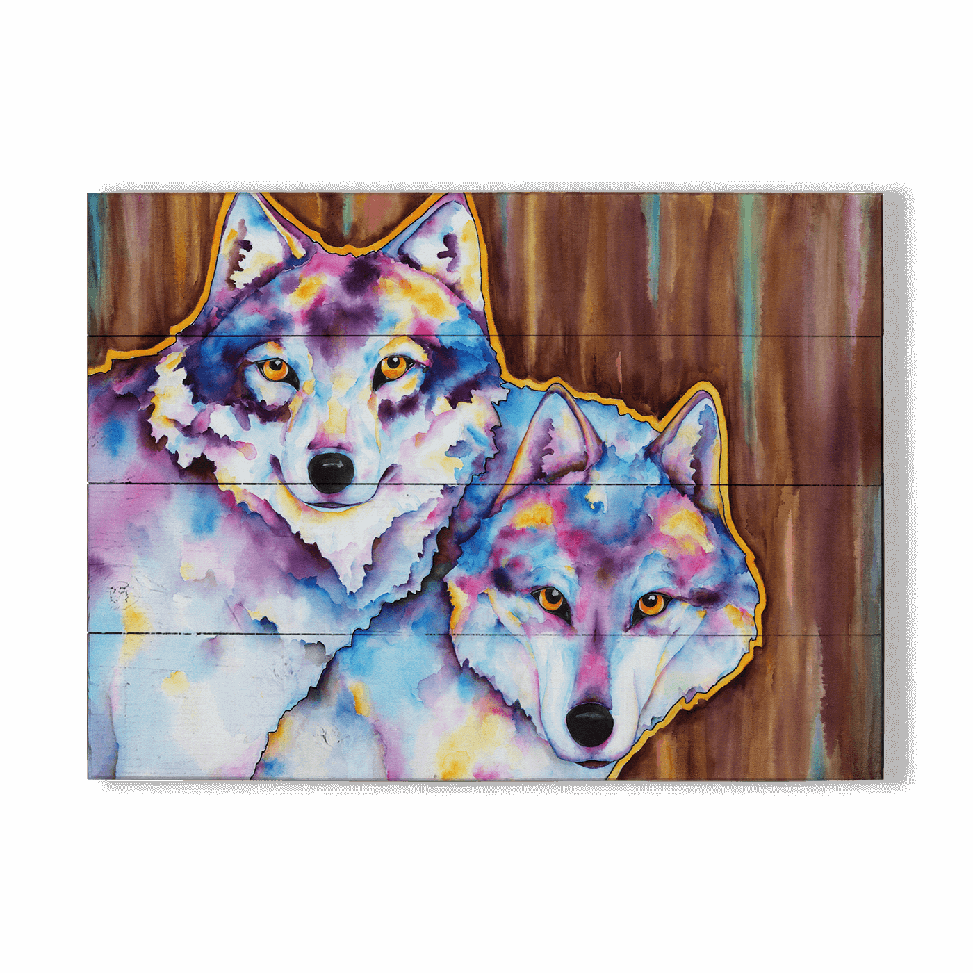 "The Call of the Wild" is a strikingly beautiful artwork that captures the essence of two wolves through a vibrant and colorful portrayal. This piece skillfully uses watercolor techniques to blend intense hues of blue, purple, and yellow, creating an almost ethereal appearance that enhances the mystical and wild nature of its subjects. The wolves’ penetrating gazes convey a deep connection to the wilderness, making this painting not only a visual delight but also a profound statement about the spirit of the natural world.