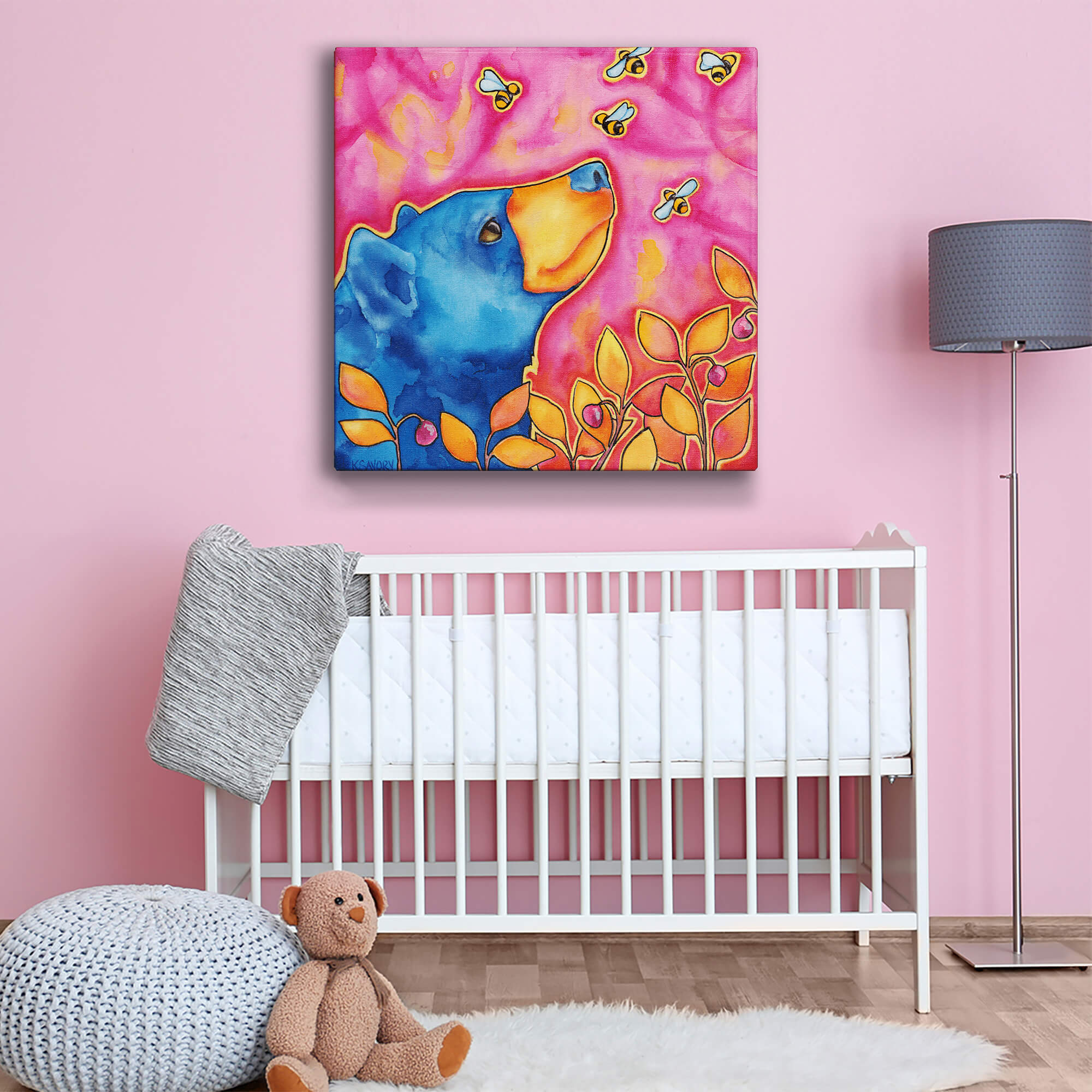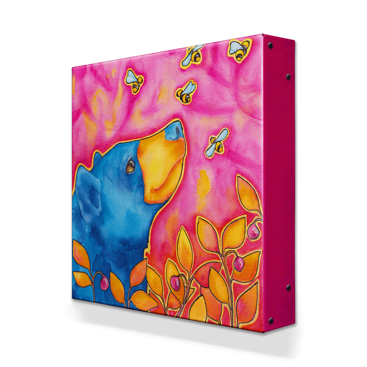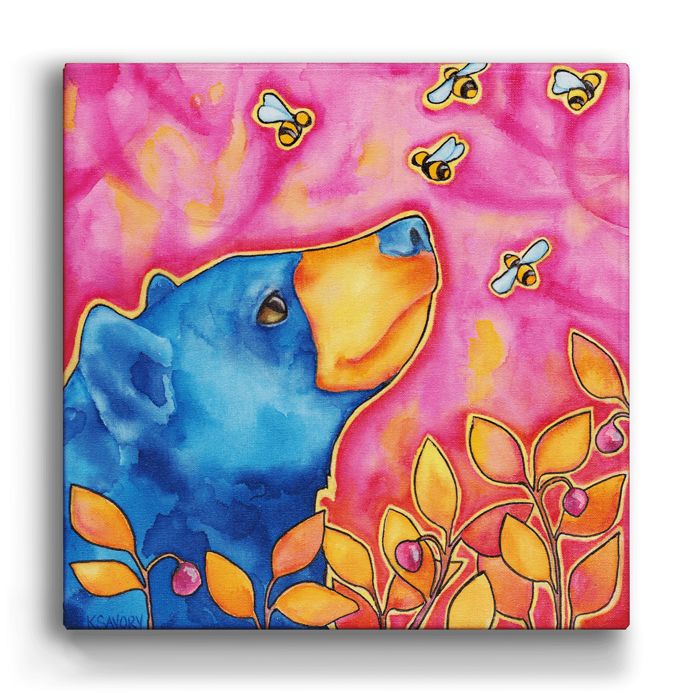 Add a burst of color and whimsy to your decor with this playful artwork of a blue bear gazing up at buzzing bees. Set against a vibrant pink background with warm orange foliage, this piece radiates charm and peace. Perfect for nature lovers and those seeking a fun, cheerful accent, this artwork brings a touch of the wild to any space.