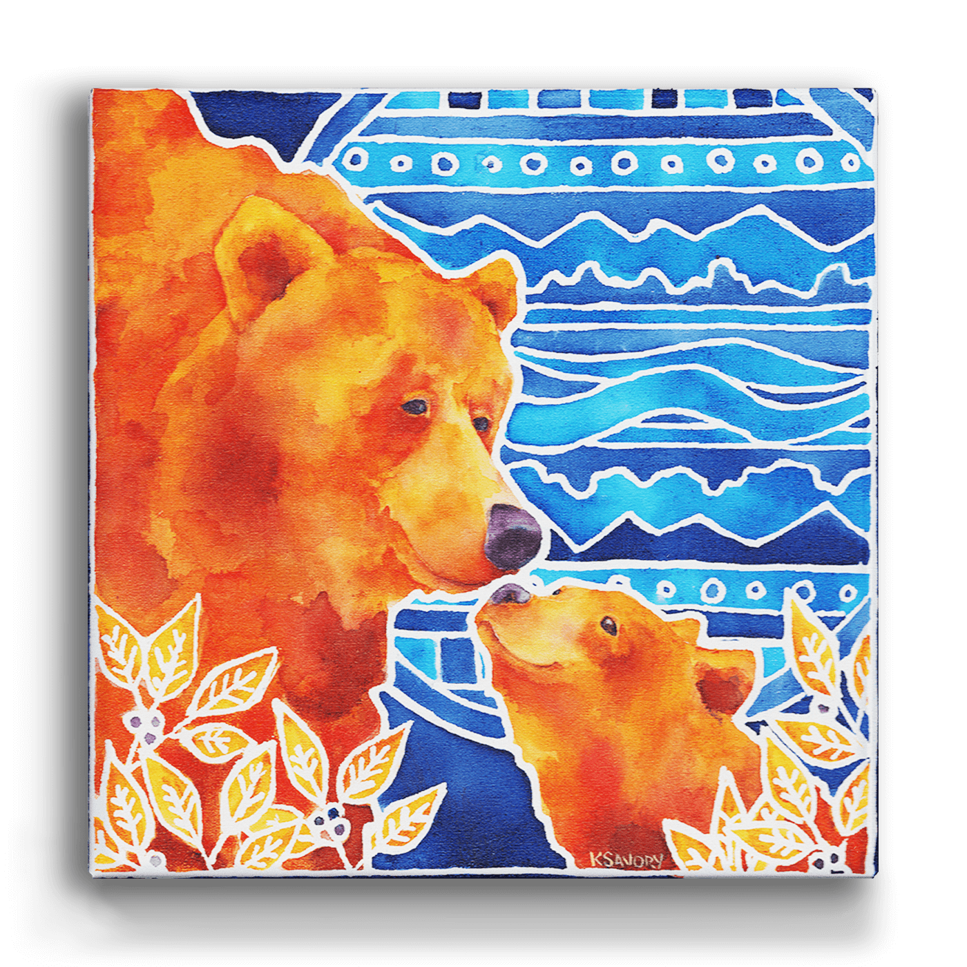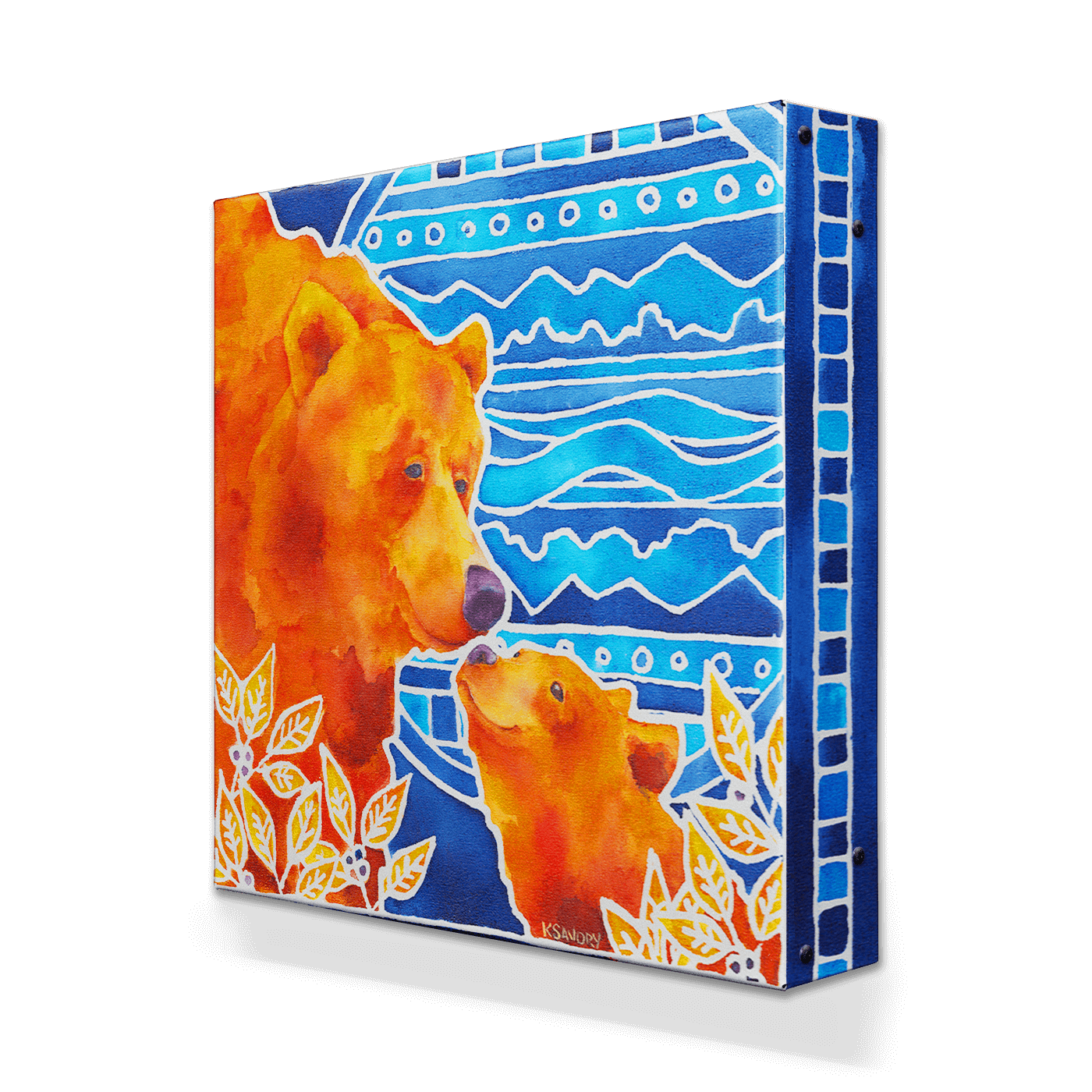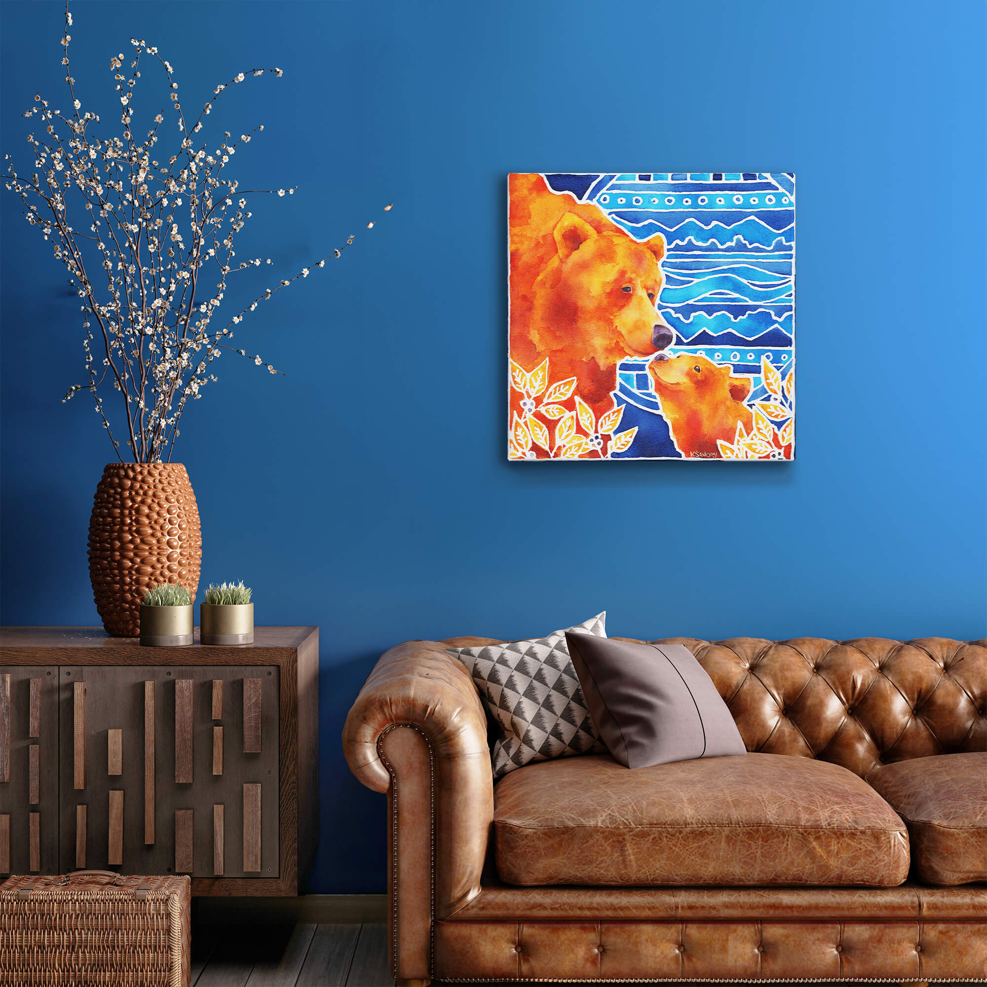 Brighten up your space with this enchanting bear-themed artwork, featuring a tender moment between a mother bear and her cub. Set against a vibrant blue patterned background, the warm, earthy tones of the bears create a beautiful contrast that draws the eye. The intricate border and botanical details add depth and elegance, making this piece a stunning focal point for any room. Perfect for adding warmth and love to your decor, this artwork is a must-have for nature lovers and those who appreciate the beauty of family connections.