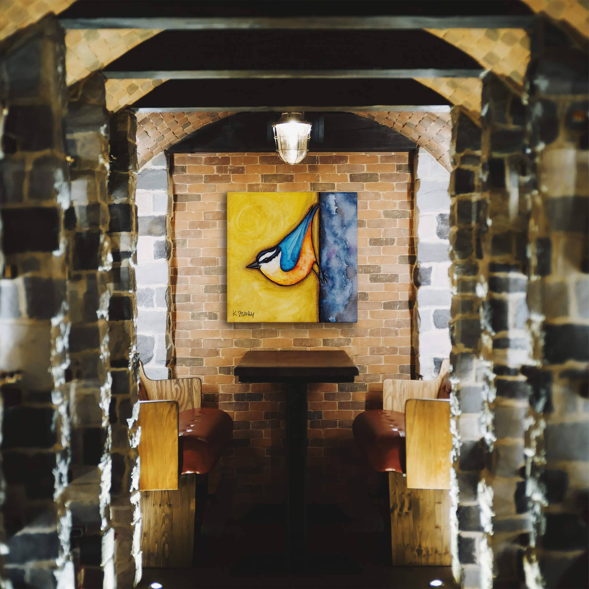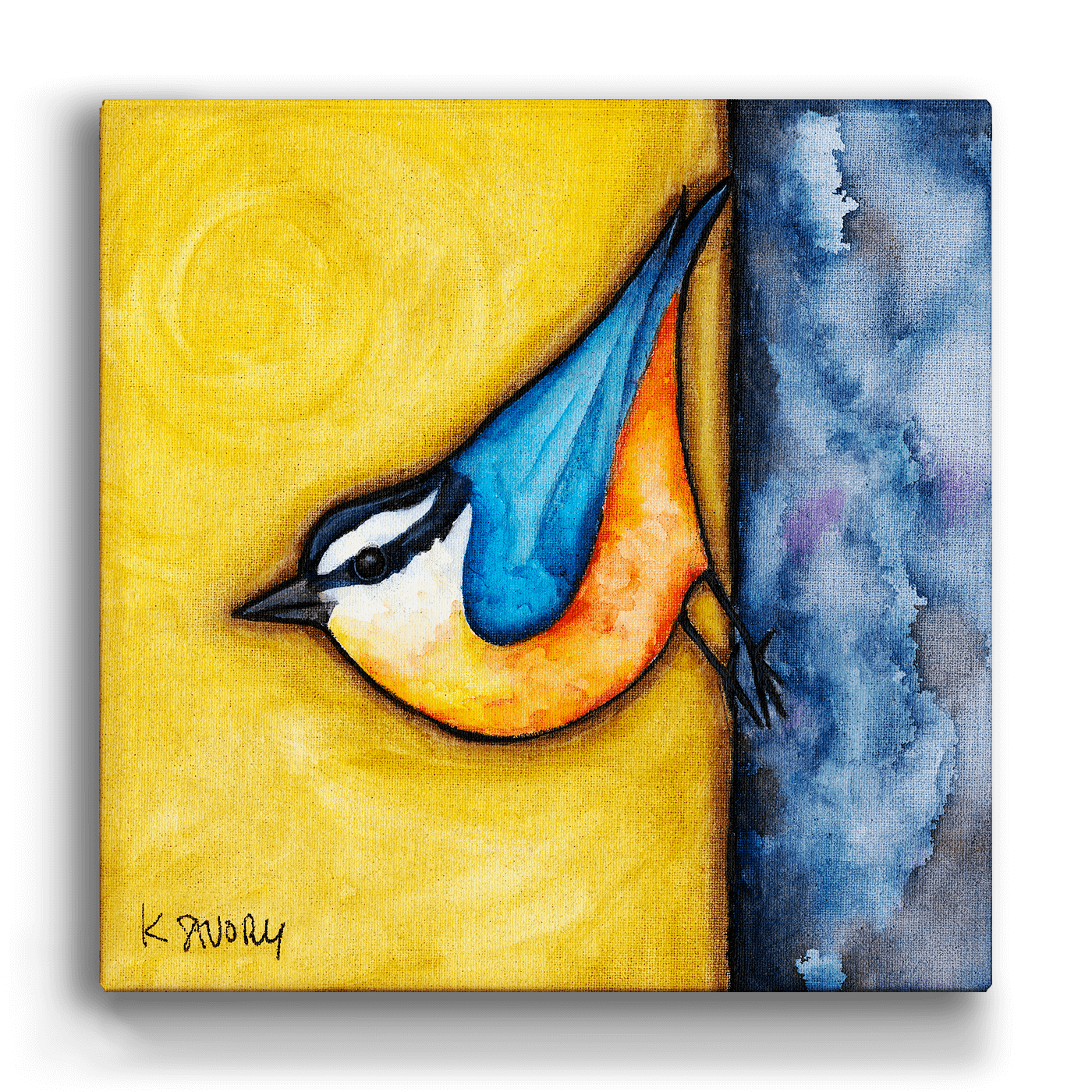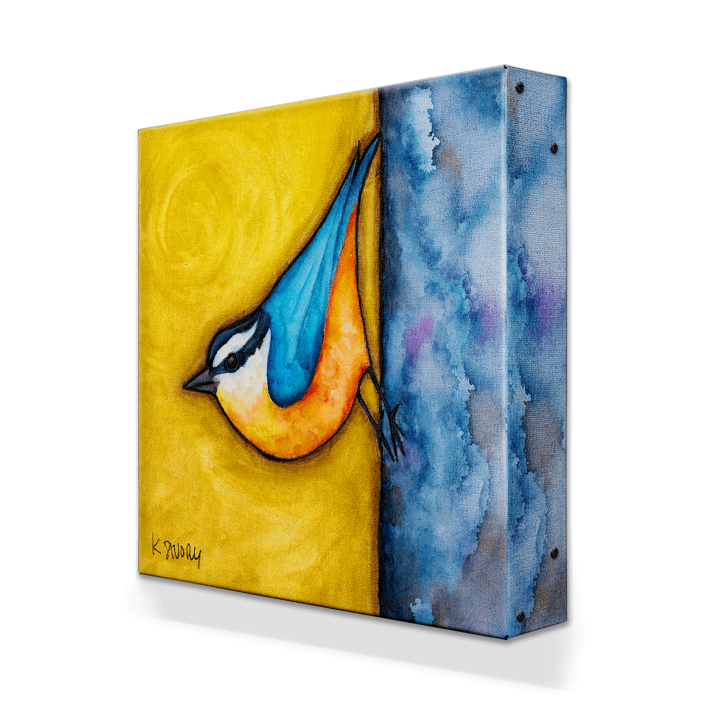 This charming artwork captures the lively spirit of a colorful bird, perched gracefully on the edge of a textured surface. Against a bright yellow background that evokes sunlight and warmth, the bird’s vibrant blue and orange plumage pops, making it an eye-catching piece. Perfect for animal lovers and art enthusiasts looking to bring a touch of brightness and the cheerful presence of natural beauty into their space.