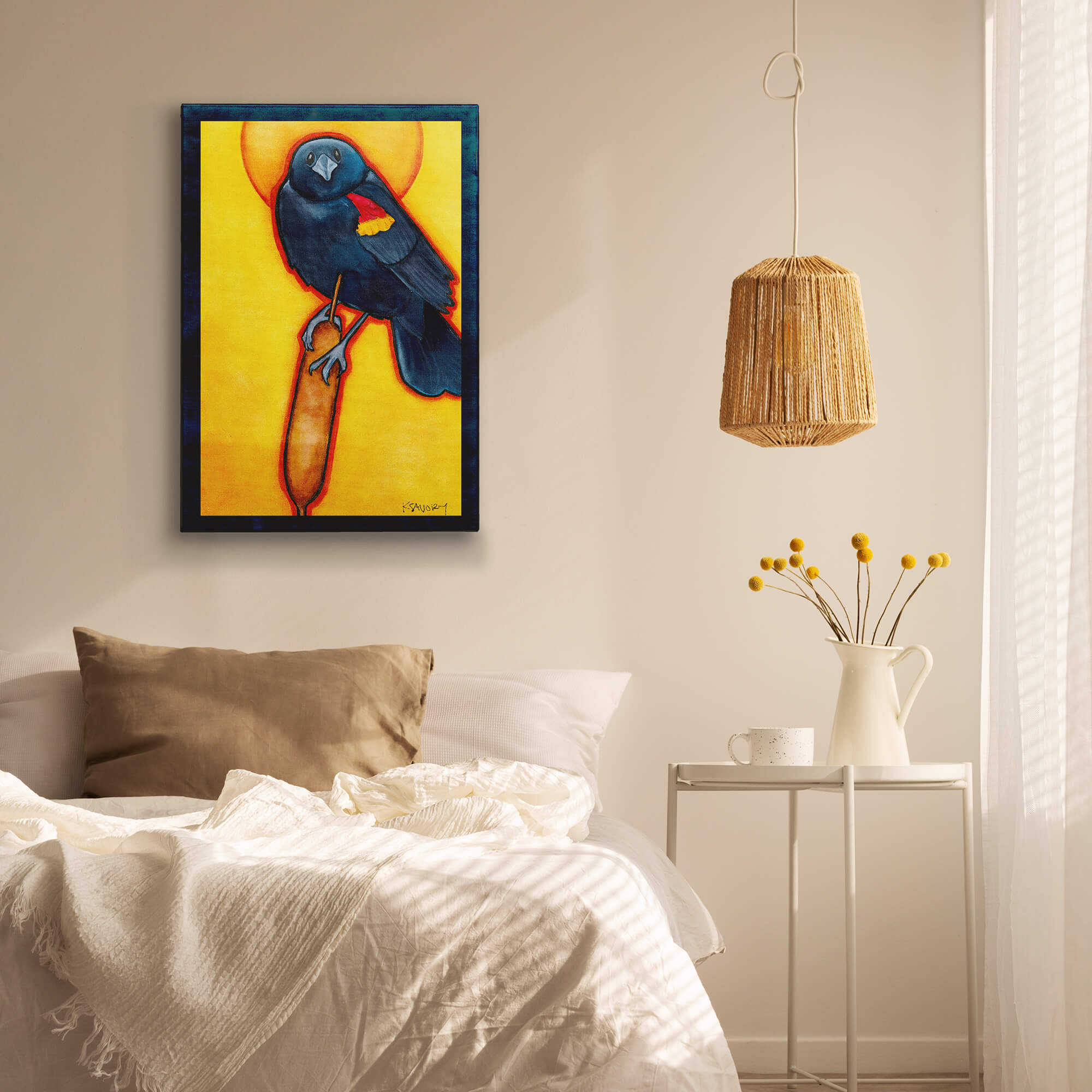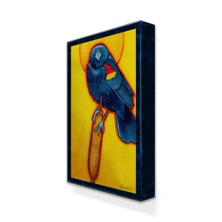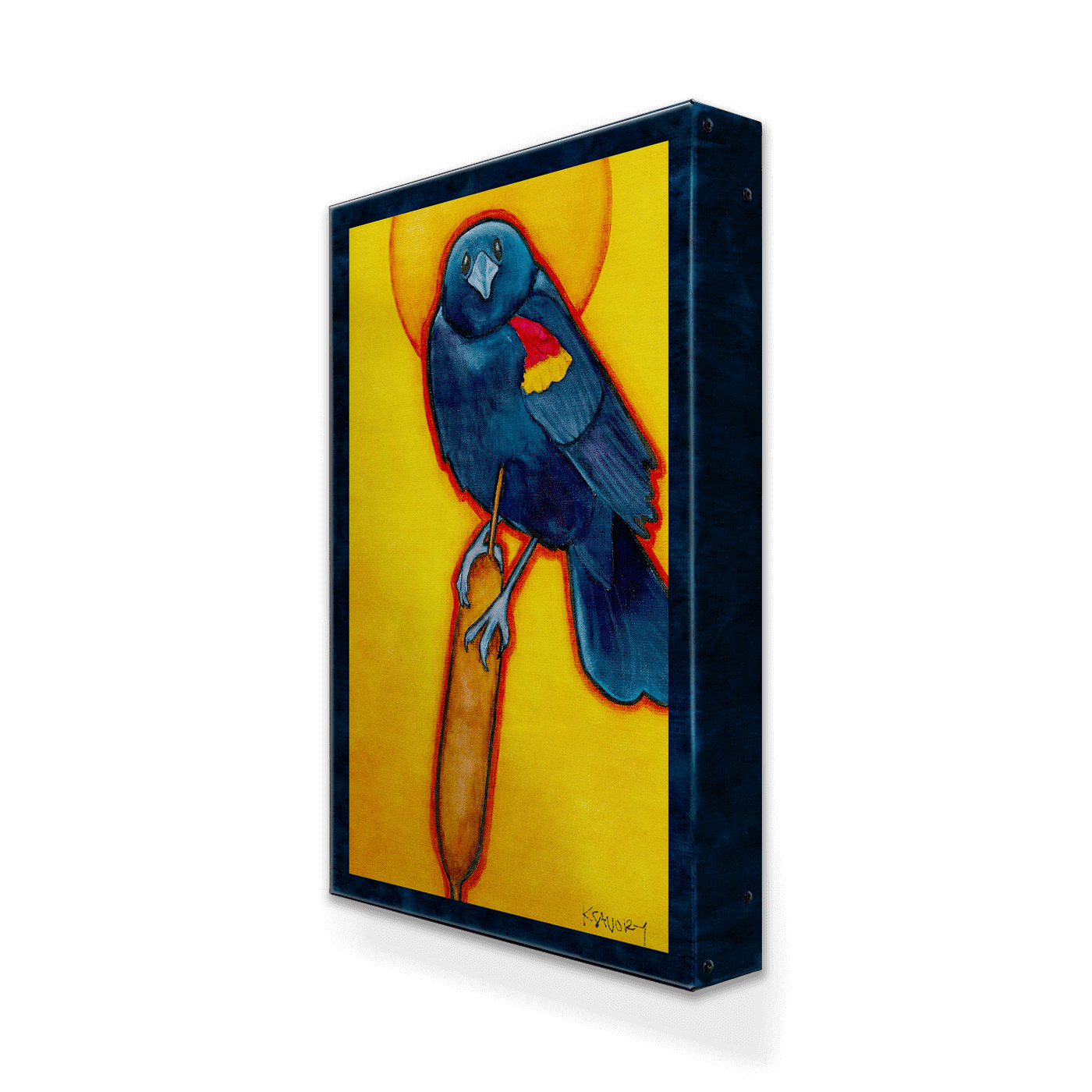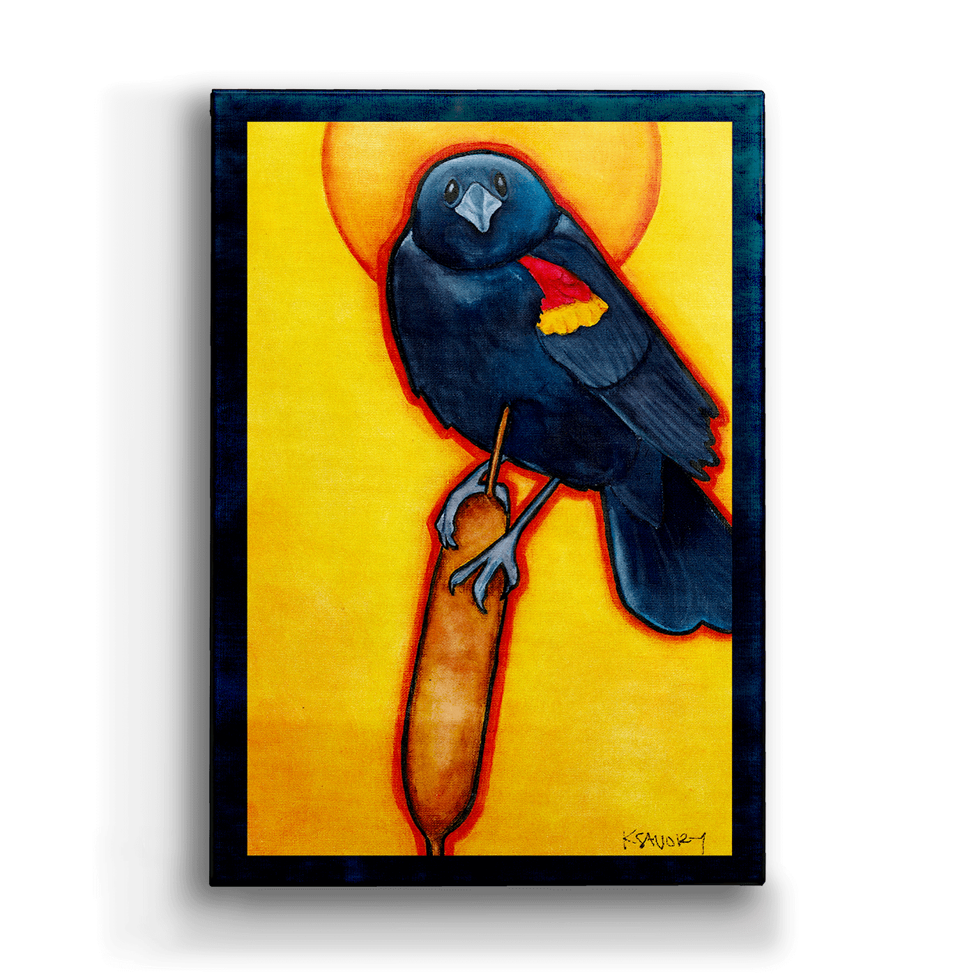 Illuminate your space with this striking artwork of a red-winged blackbird perched gracefully on a cattail, bathed in the golden glow of a radiant, sunny halo. The bold contrast of deep blue-black against vibrant yellows brings this elegant bird to life, evoking a sense of majesty and reverence for nature's beauty. Perfect for bird lovers and art enthusiasts alike, this piece captures the drama of wildlife in a modern, spiritual style.