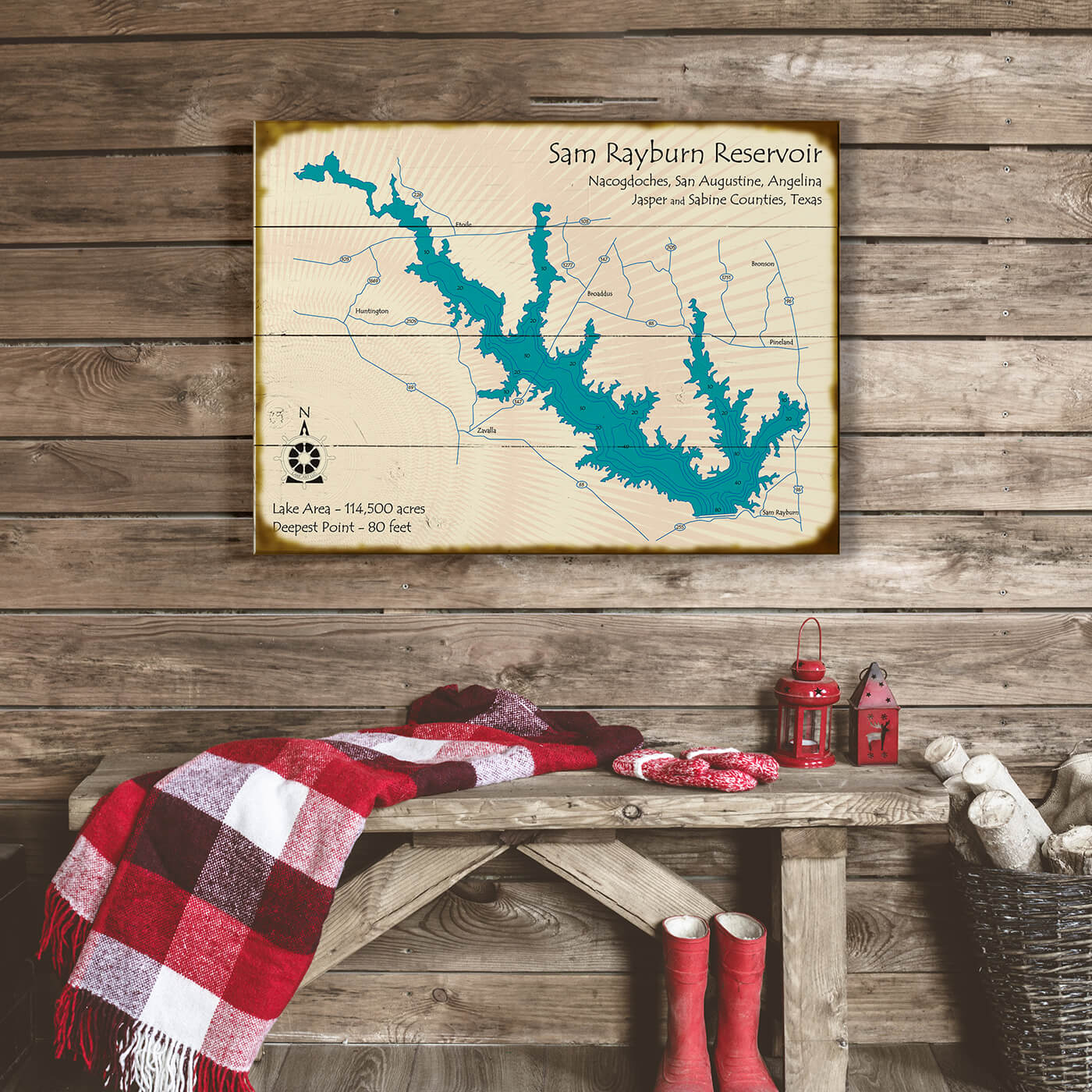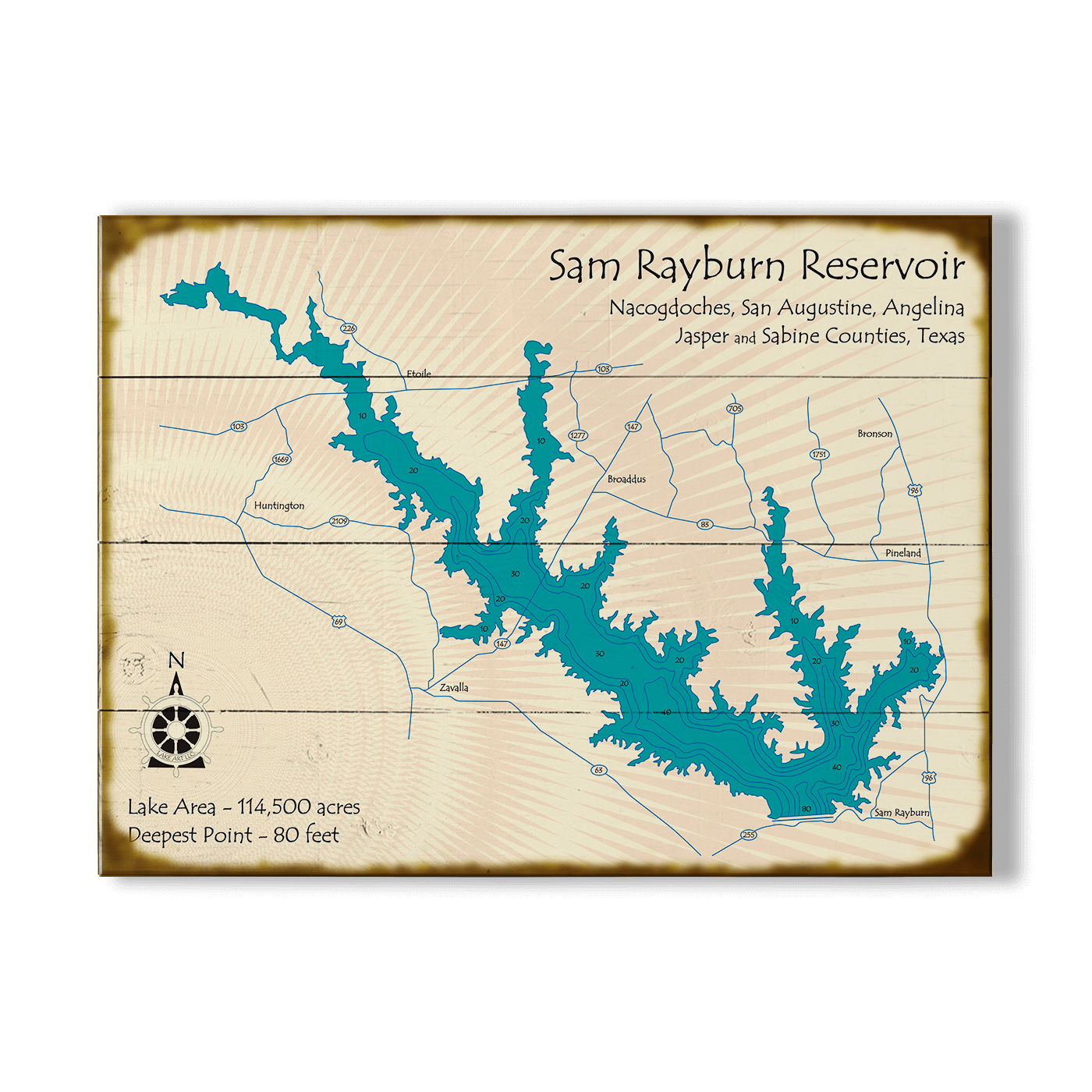 This elegant map art presents the vast expanse of Sam Rayburn Reservoir, a crown jewel in the heart of East Texas. Spanning a remarkable 114,500 acres and reaching depths of up to 80 feet, Sam Rayburn Reservoir is not only the largest lake wholly contained within the state of Texas but also a renowned haven for those interested in all manner of water sports.