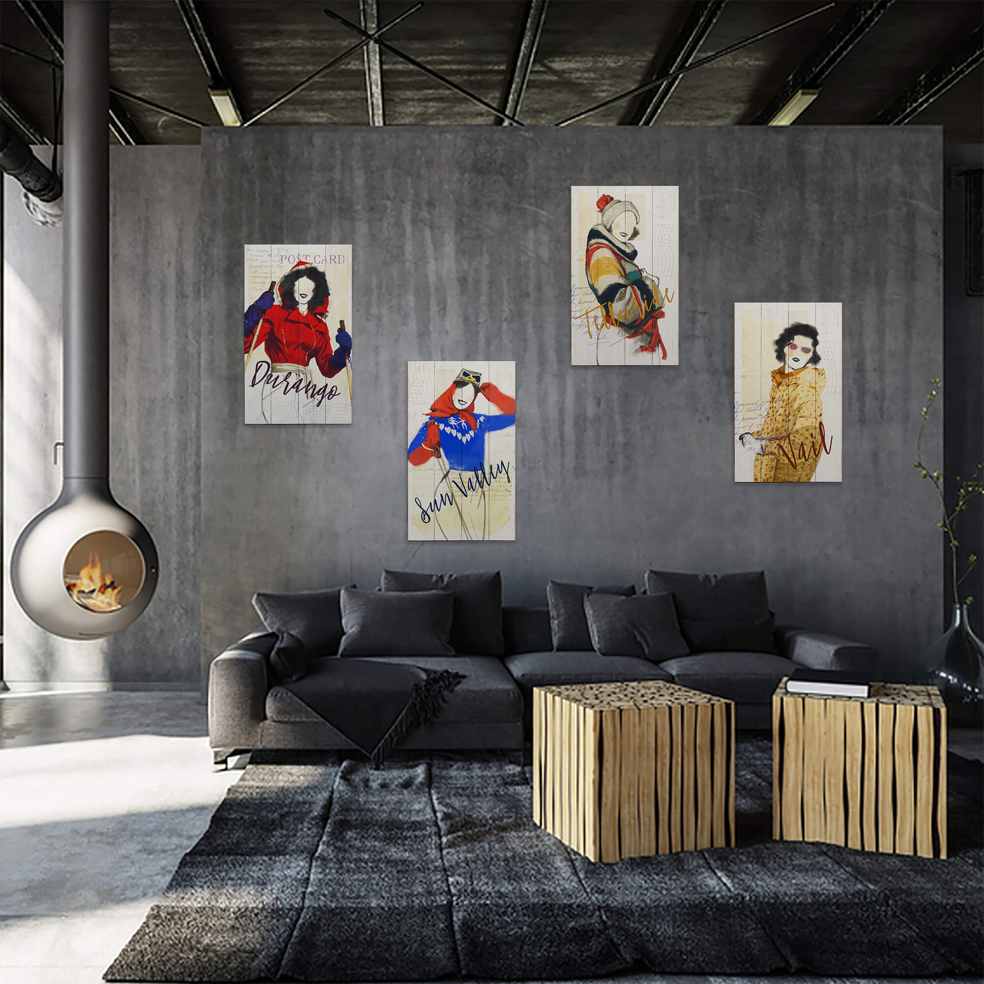 Wrapped in a cozy, oversized striped coat and matching pom-pom beanie, this stylized skier radiates après-ski confidence and vintage charm. The softly textured background features handwritten script, faded stamps, and postal markings that give the piece a nostalgic, well-traveled feel. With her rosy cheeks, relaxed stance, and warm layers in bold retro tones, she’s ready for a mountain town stroll or fireside unwind. A tribute to winter warmth, effortless style, and timeless alpine fashion.