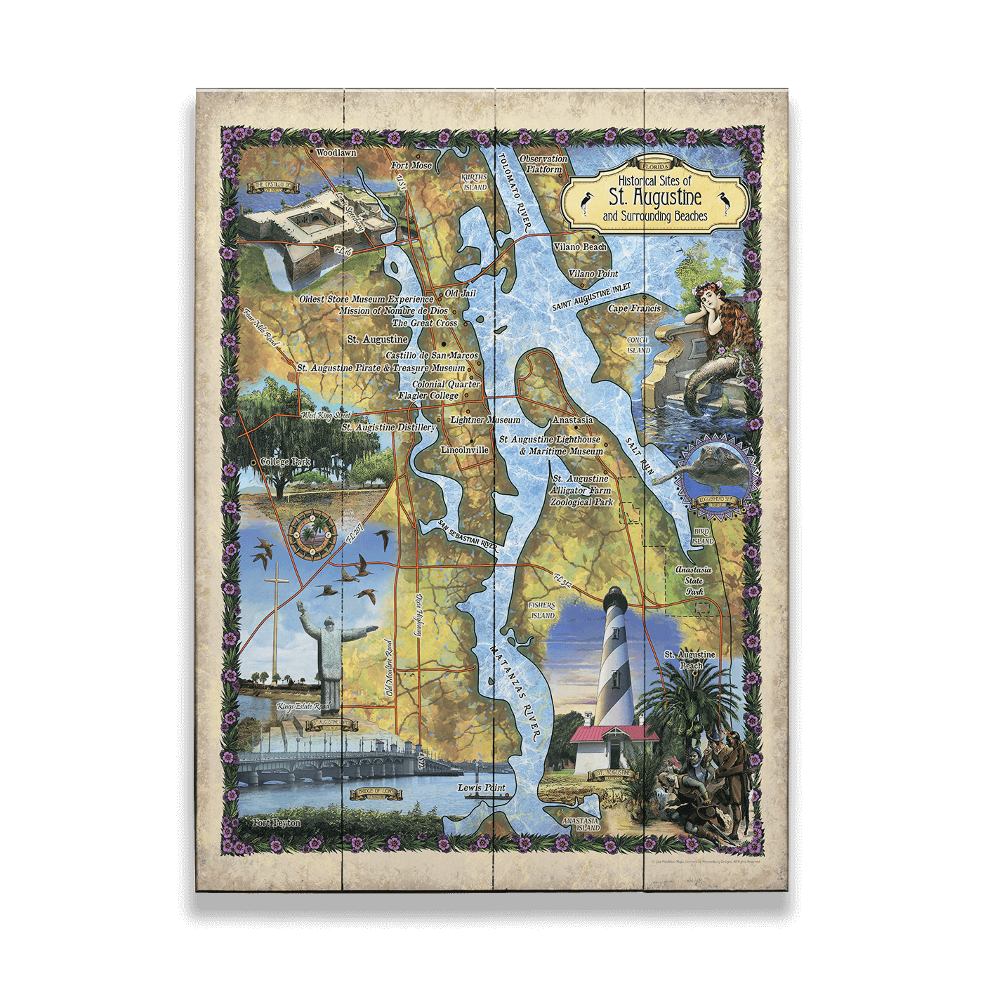 Our illustrated map of St. Augustine, Florida, is a vibrant tribute to the historic charm and coastal beauty of this beloved region. Bursting with colorful illustrations and artistic flair, this map invites you to explore the rich heritage and idyllic shores that define St. Augustine and its neighboring beaches. From the iconic Castillo de San Marcos and the cobblestone streets of the Old City to the pristine sandy stretches of Anastasia Island and Vilano Beach, each illustration captures the essence of this captivating coastal destination.