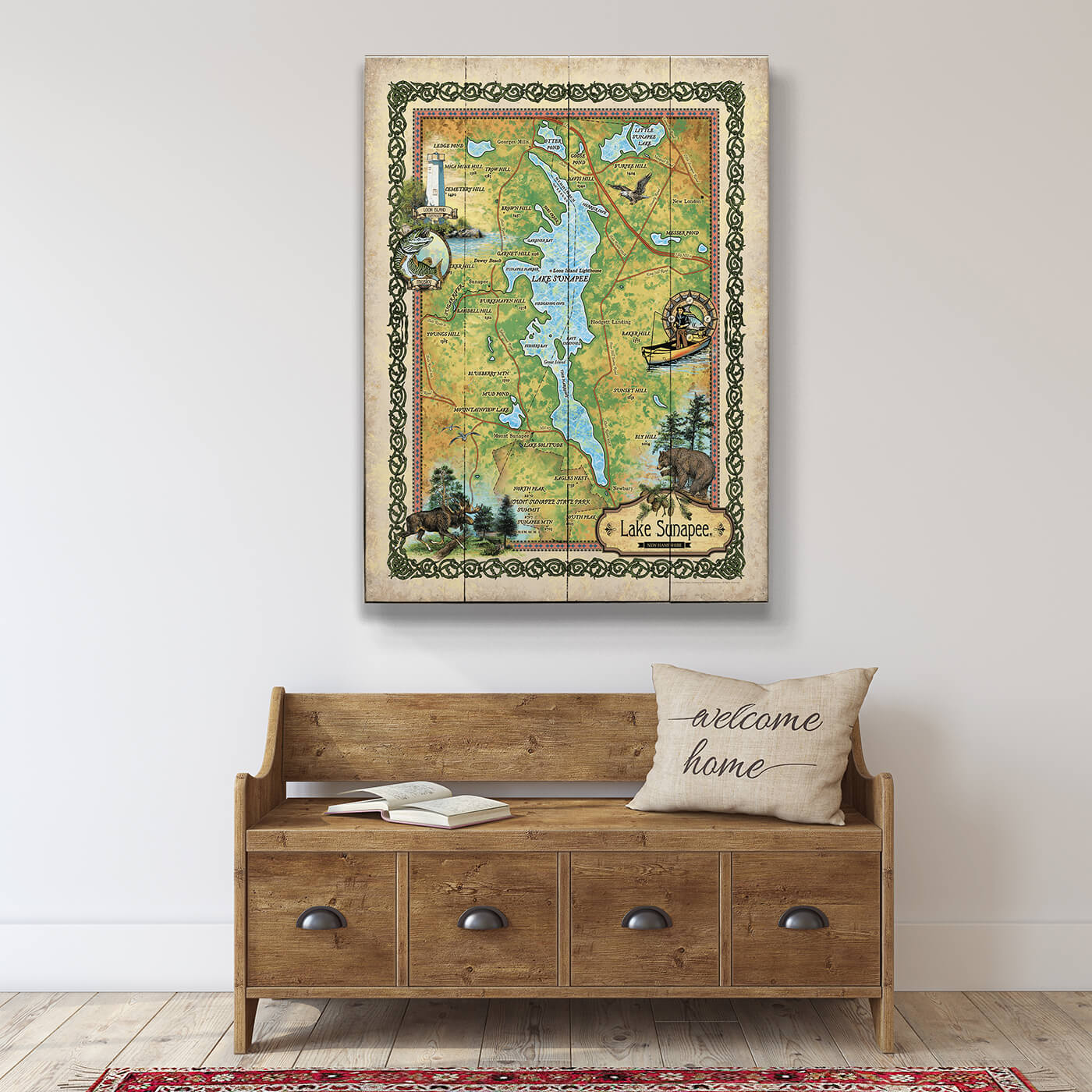Featuring intricate details and charming embellishments, this artwork captures the essence of this beloved lake and its surroundings. From local wildlife to historical sites, each element is beautifully represented, making this map not only a piece of art but also a valuable guide for exploration and appreciation. Ideal for decorating a home or as a unique gift, this map is a treasure for anyone who loves Lake Sunapee.