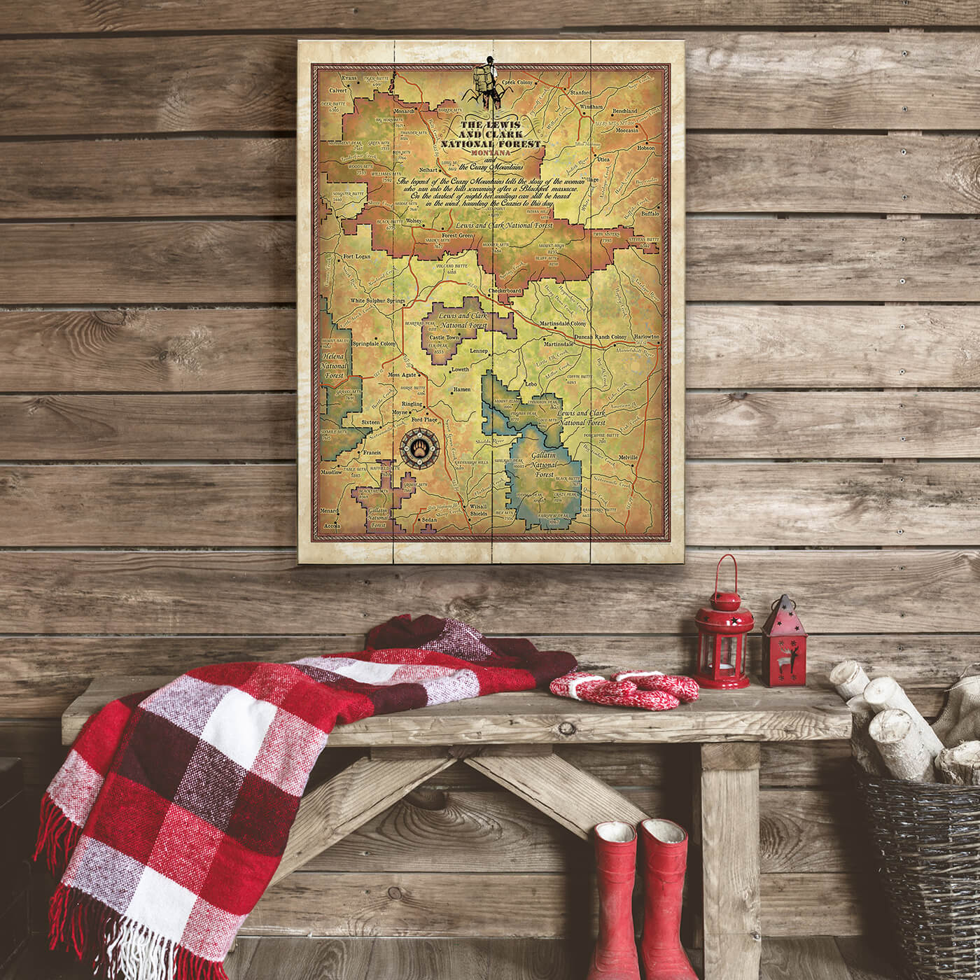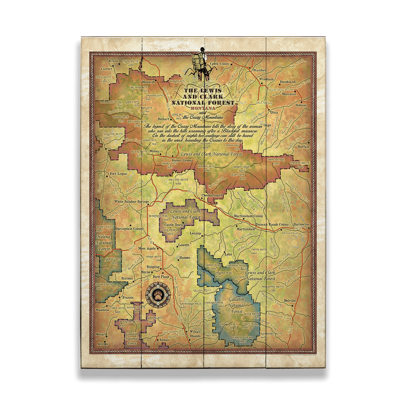Lewis and Clark National Forest: Illustrated Map - Wood & Metal Wall Art
