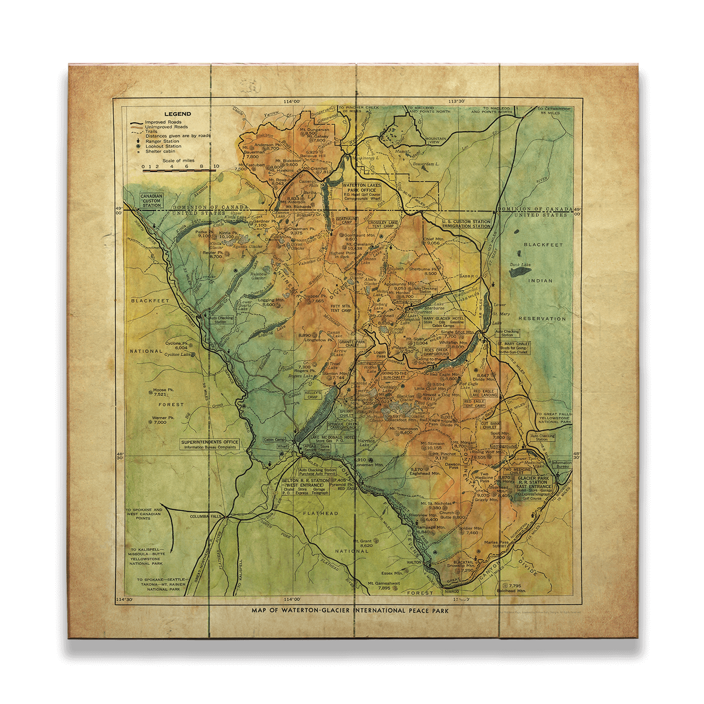 Discover the breathtaking landscapes and intricate geography of Waterton-Glacier International Peace Park with this vintage map. Richly colored and detailed, it covers the expansive park area that spans the border between the U.S. and Canada, offering a unique glimpse into the rugged terrain and natural beauty of this UNESCO World Heritage site. Ideal for environmentalists, history enthusiasts, and collectors of geographic art, this map serves as both an educational tool and a stunning piece of historical decor, celebrating the first International Peace Park and its commitment to conservation and peace.