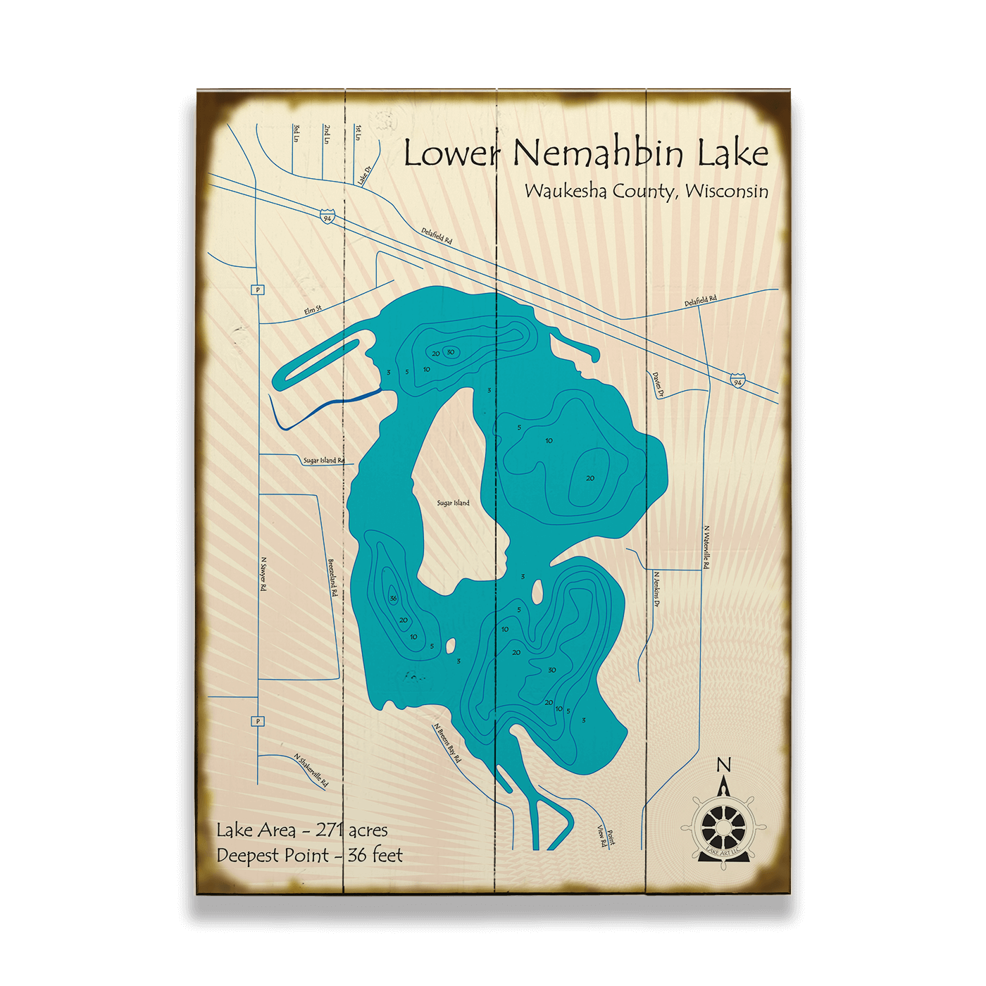 This elegant lake map showcases Lower Nemahbin Lake with crisp bathymetric contours, shoreline details, and surrounding roads arranged in a clean vintage-inspired layout. The warm color scheme and compass rose accent give it a nostalgic charm. Ideal for anyone who fishes, boats, or spends summers along the water, this artwork brings a piece of Waukesha County’s natural beauty into your home, cabin, or lakeside retreat.