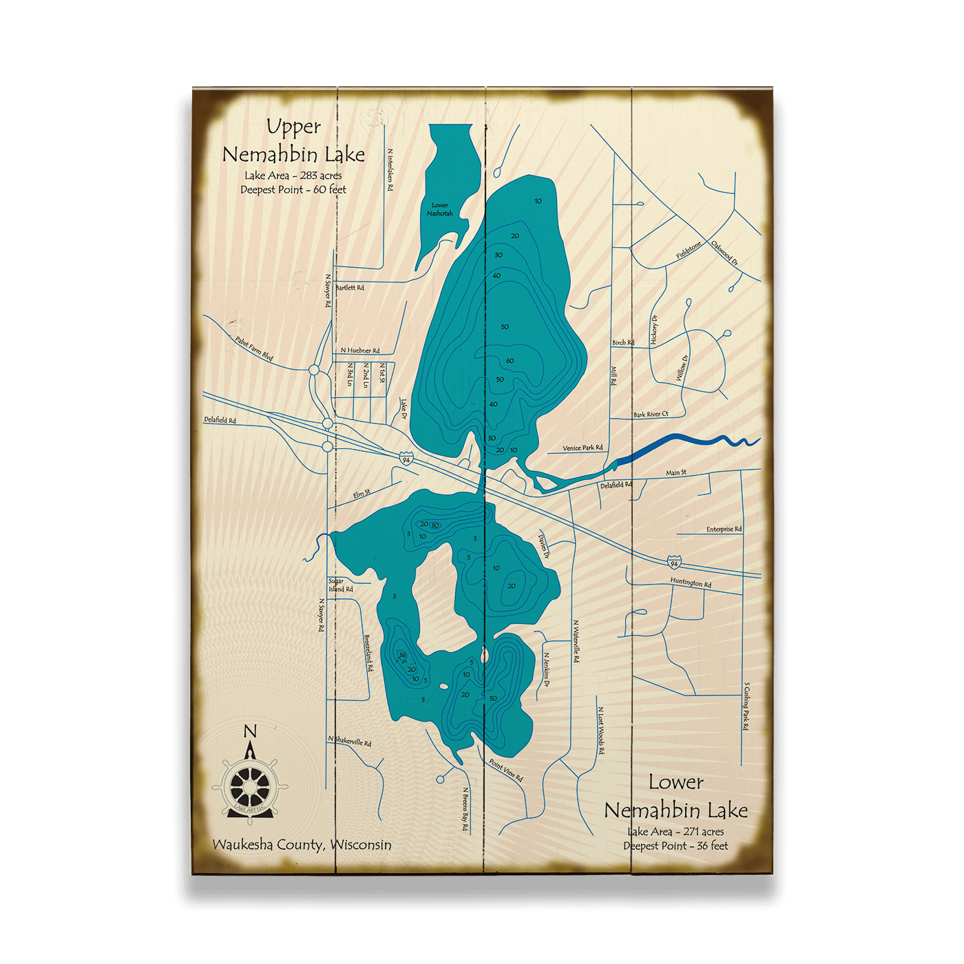Explore the scenic waterways of Waukesha County with this detailed map of Upper and Lower Nemahbin Lake. Styled in a warm vintage palette, the artwork highlights shoreline features, depth contours, local roads, and the natural flow between the two connected basins. The clean cartographic design brings clarity to the lake’s shape and structure, while the distressed edges give the piece a timeless, classic feel. Perfect for lake houses, cabins, and anyone who enjoys boating, paddling, fishing, or summers in Wisconsin’s lake country, this map makes a beautiful tribute to a favorite place on the water.