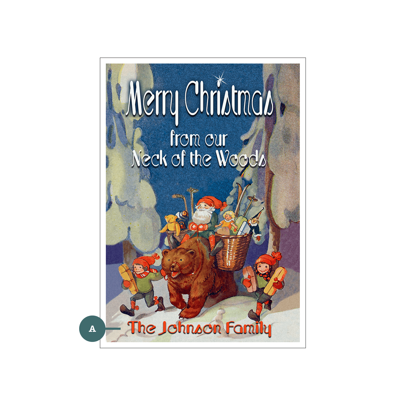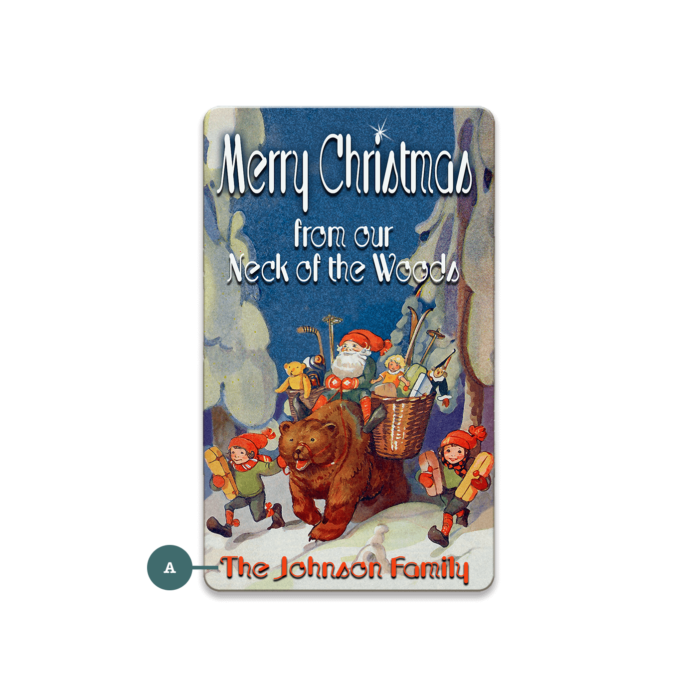 This whimsical Christmas sign captures a delightful woodland holiday scene, featuring an elven Santa riding a cheerful brown bear through a snowy forest and accompanied by his helpers. With toy-laden baskets and festive cheer, the playful artwork radiates charm and nostalgia. The “Merry Christmas from our Neck of the Woods” message adds a personal, heartfelt touch, while the bottom line is customizable with your family name. Perfect for cabins, lodges, or nature lovers looking to add a rustic twist to their holiday décor.