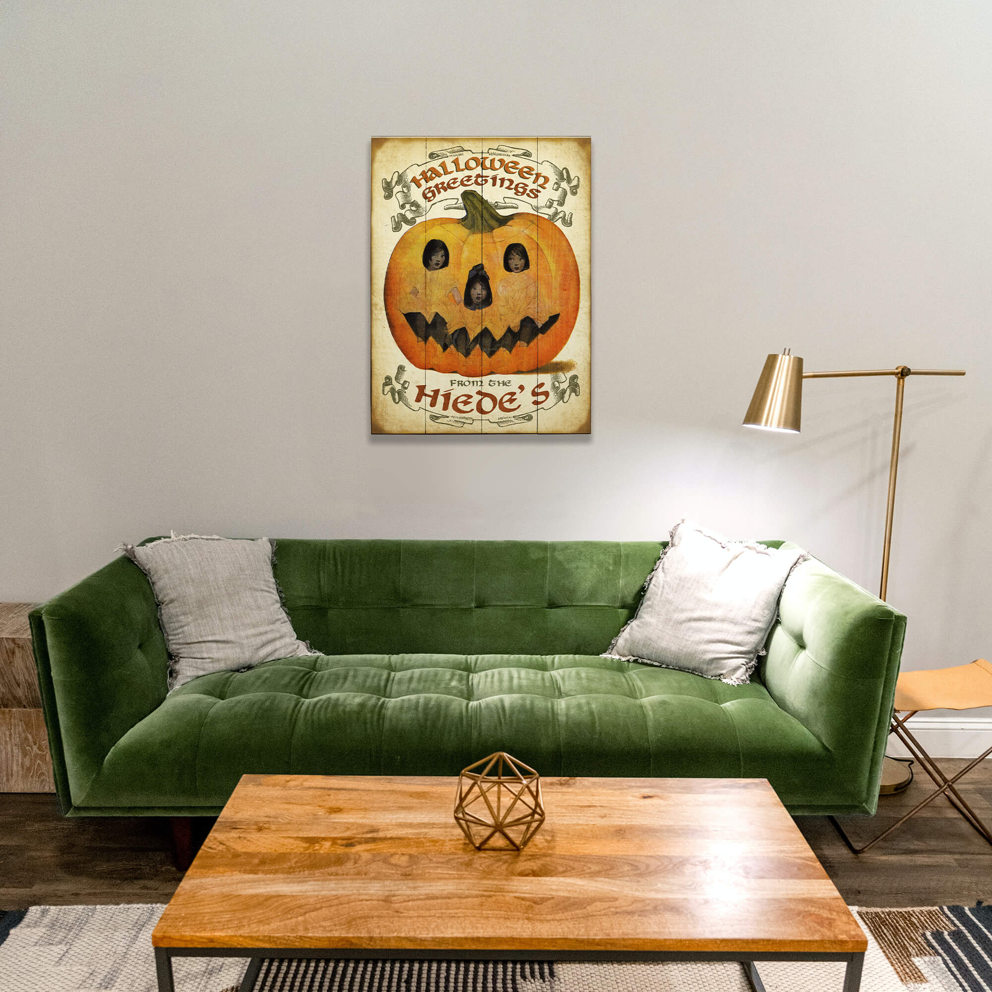 A playful blend of charm and curiosity, this Halloween sign features a grinning jack-o'-lantern with the heads of three children peeking through as its eyes and nose, creating a whimsical and surreal autumn scene. The parchment-style background, aged edges, and vintage lettering evoke a bygone era of Halloween traditions, while the warm tones of orange and cream add nostalgic flair. A delightful addition to entryways, seasonal displays, or festive gatherings, this piece extends the invitation to embrace the fun of fall with a personalized touch.