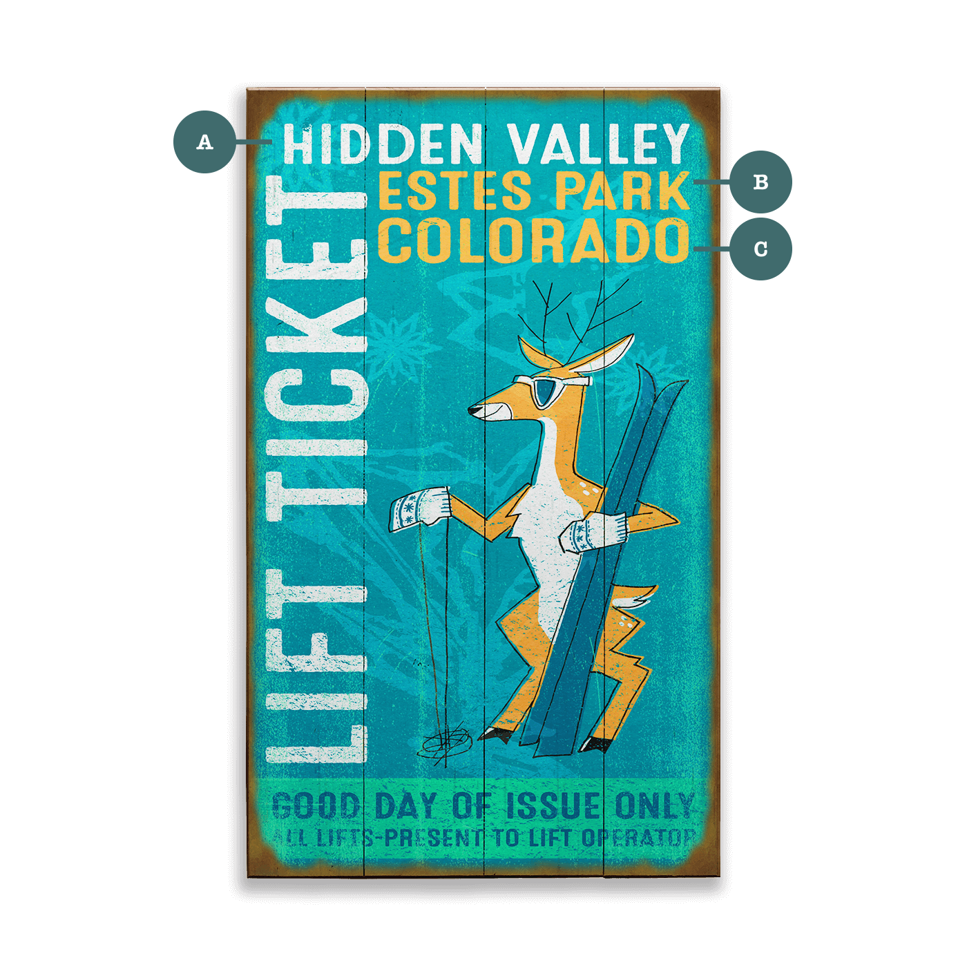 This playful sign showcases the charm of Hidden Valley in Estes Park, Colorado. Featuring a fun, retro-style deer contemplating the slopes, the design captures the lively spirit of this beloved winter destination. Perfect for adding a touch of nostalgia to your space, this sign is ideal for ski enthusiasts and Colorado lovers alike.