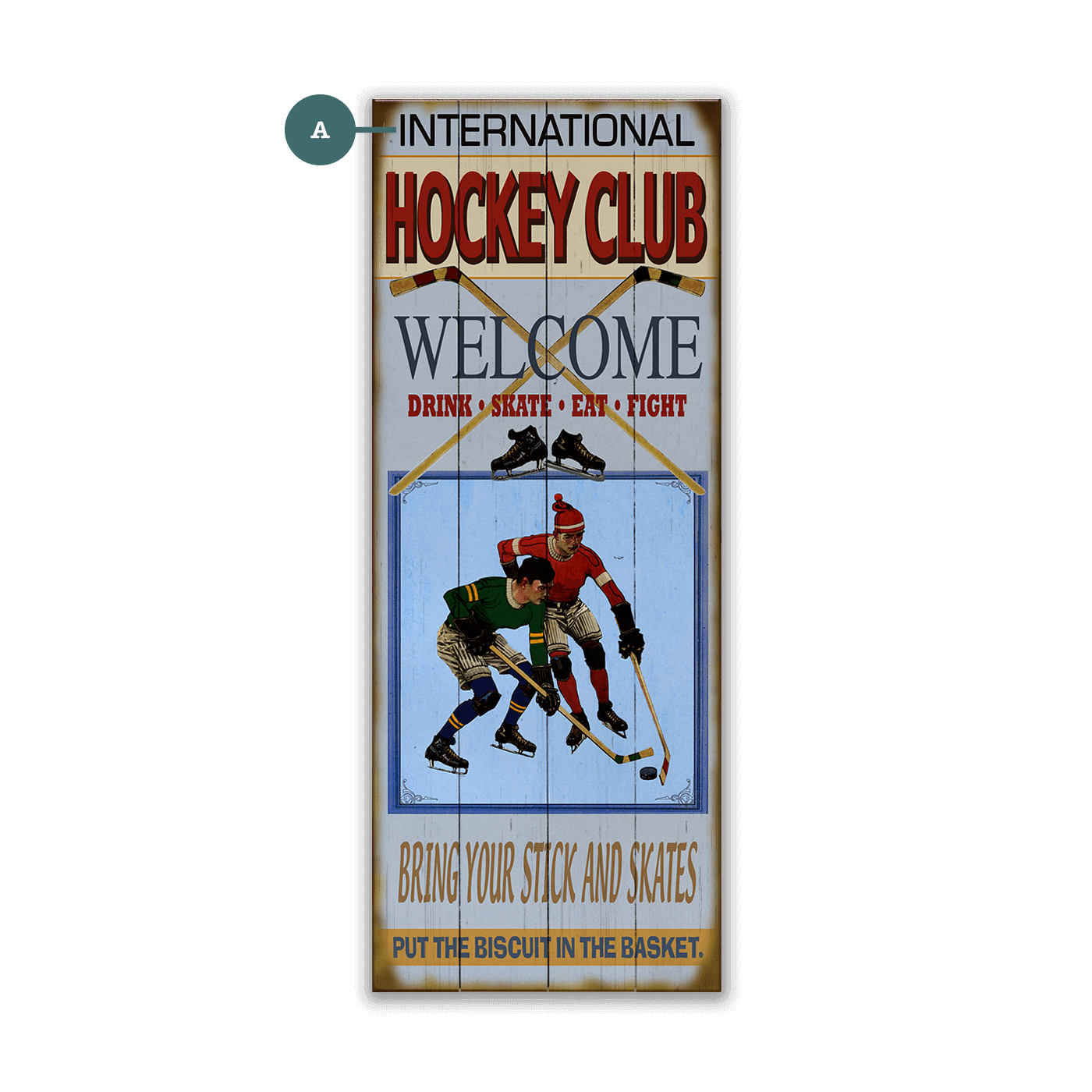 Discover the charm of vintage sports with this Hockey Club artwork. This retro-inspired piece features two classic hockey players in action, evoking a sense of nostalgia and excitement. The vibrant colors and detailed design make it a perfect addition to any sports enthusiast's collection. Whether you're a hockey fan or an art lover, this sign is sure to bring a touch of history and fun to your space. Embrace the spirit of the game with this unique and timeless decoration.