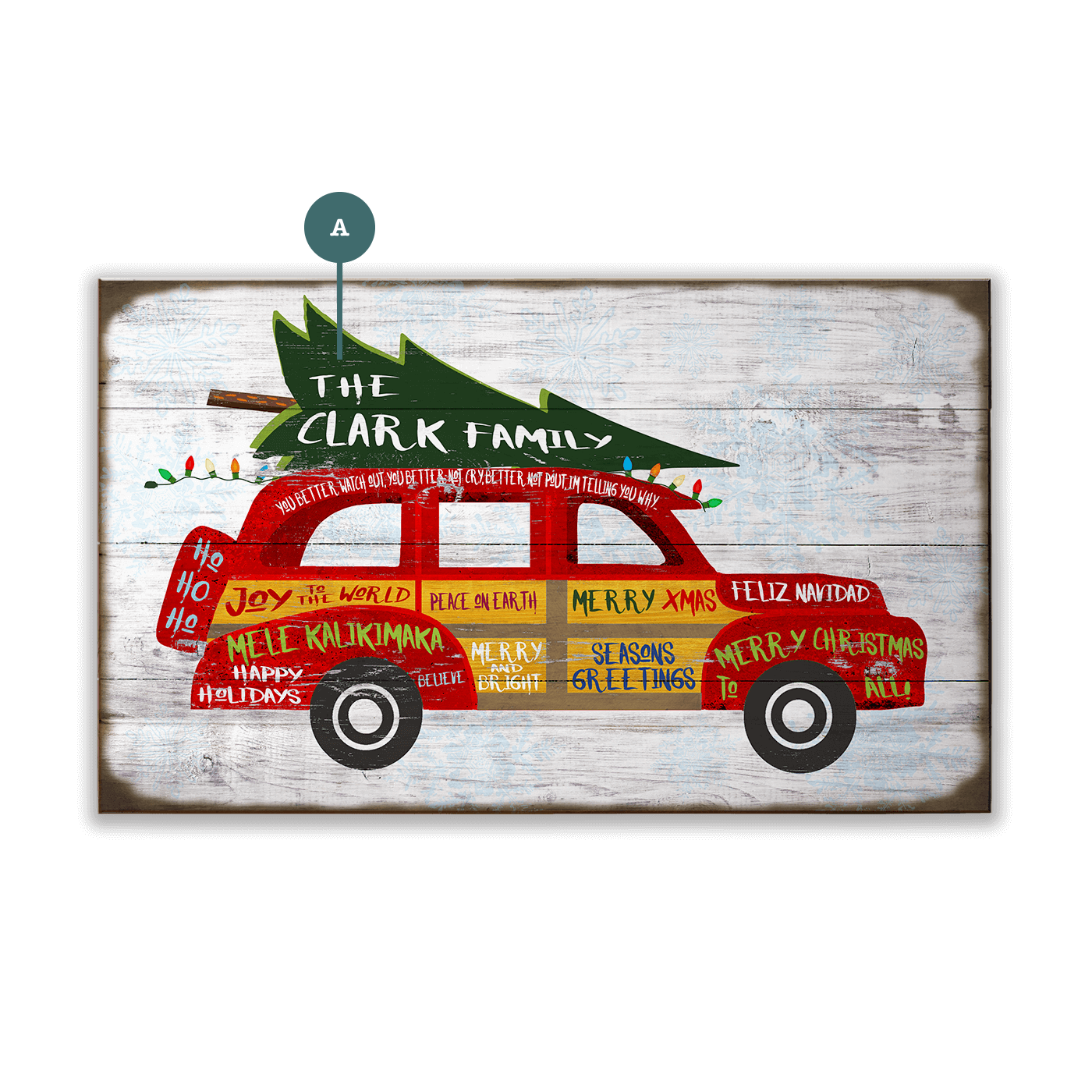 Loaded with charm and holiday cheer, this festive wall art features a bright red station wagon toting a Christmas tree across a snow-dusted background. The car’s panels are cheerfully covered in greetings like “Joy to the World,” “Mele Kalikimaka,” and “Merry Christmas to All,” capturing the joyful chaos of the season. A customizable name on the tree adds a personal touch, while the vintage-style design makes it ideal for entryways, family rooms, or holiday gatherings. It’s a merry way to welcome the most wonderful time of the year.