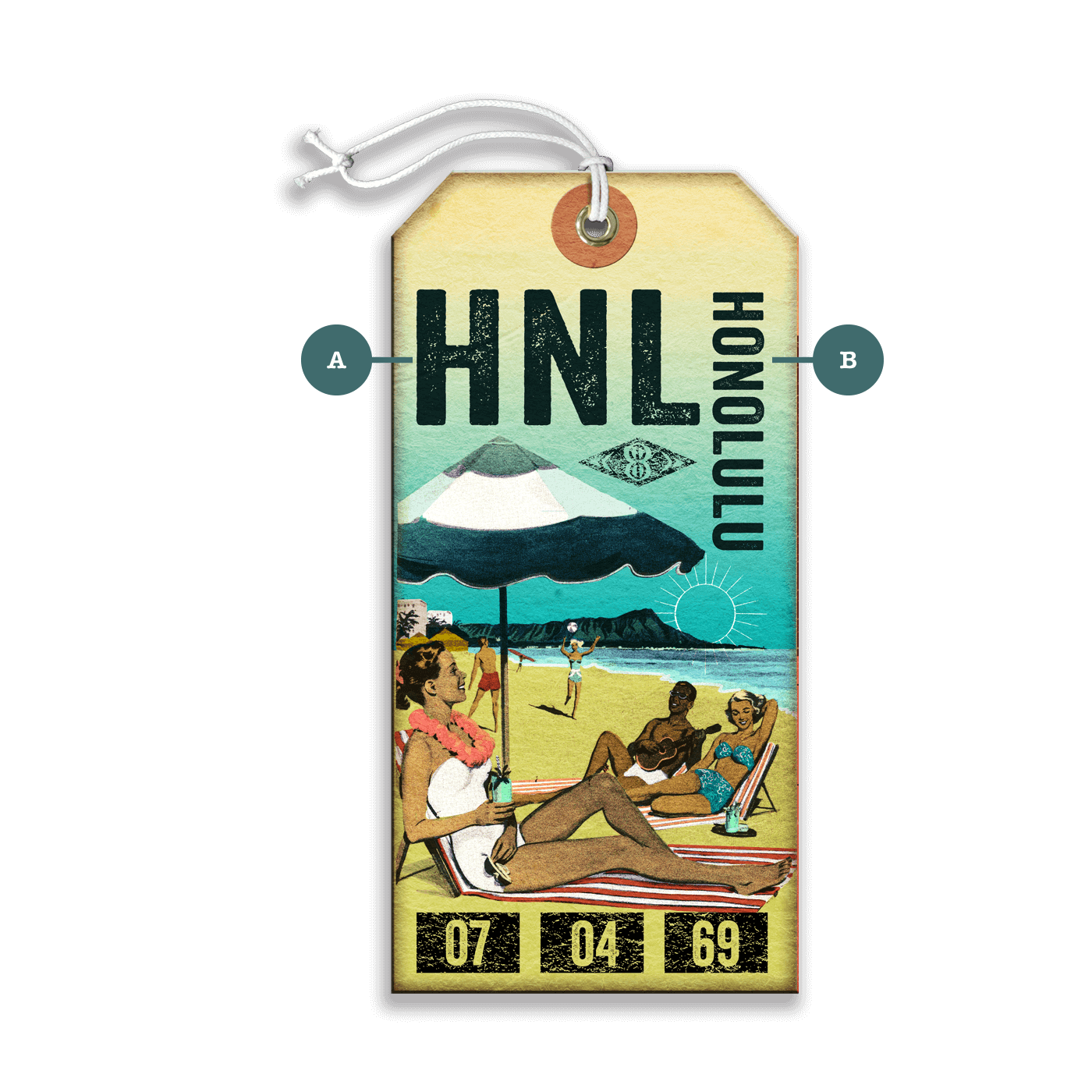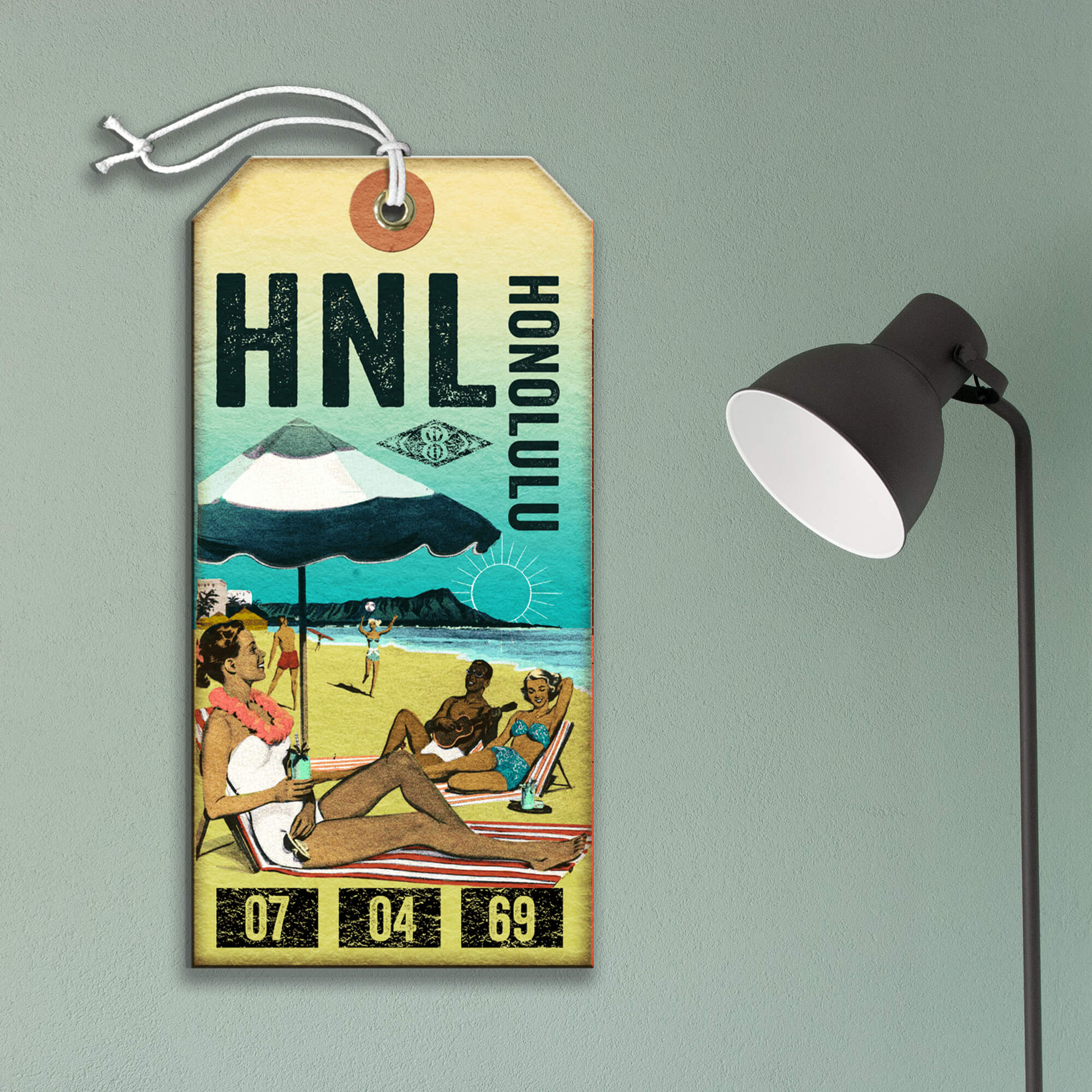 Dive into the vibrant beach culture of Honolulu with this evocative travel tag, capturing the laid-back spirit of Honolulu. Featuring a nostalgic beach scene with sunbathers, surfers, and iconic palm trees under a radiant sun, this tag embodies the relaxed and inviting atmosphere of Hawaii's capital. Whether you're reminiscing about your Hawaiian vacation or dreaming of sandy shores, this beautifully illustrated tag is a perfect addition to any travel lover's collection, or as a unique gift to ignite wanderlust.