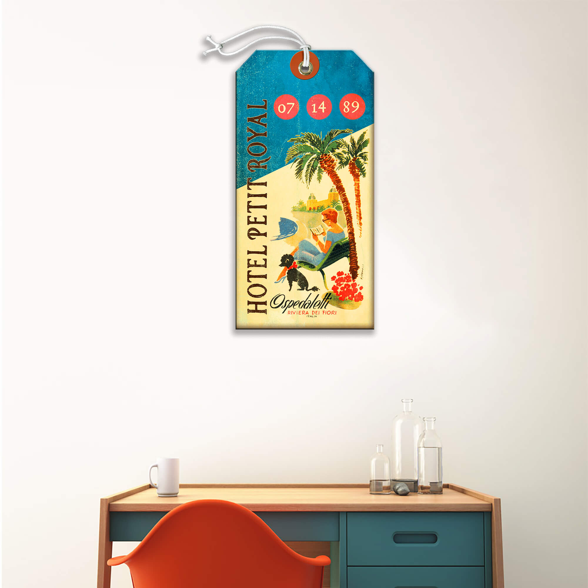 This beautifully crafted luggage tag artwork features a nostalgic design for the Hotel Petit Royal in Ospedaletti, nestled along the stunning Riviera dei Fiori in Italy. The tag captures the essence of a classic Mediterranean getaway, with vibrant illustrations of a serene seaside retreat under the shade of palm trees. The rich colors and retro style make it a standout addition, evoking memories of luxurious holidays on the Italian coast.