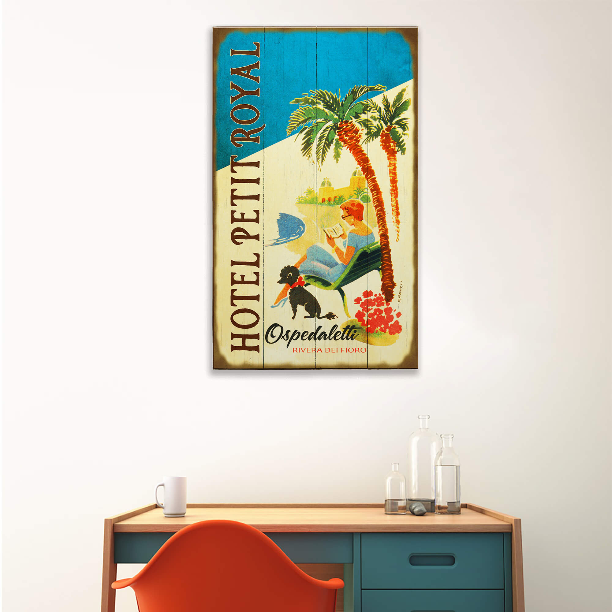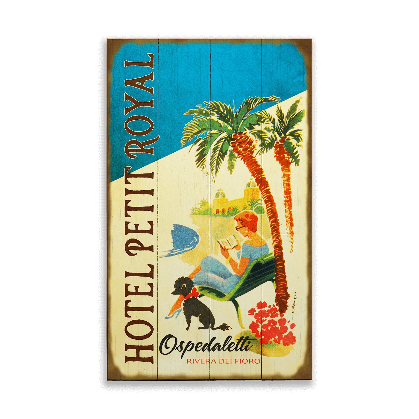 This charming artwork features a vintage-inspired design for the Hotel Petit Royal in Ospedaletti, located on the picturesque Riviera dei Fiori. The piece beautifully captures the idyllic Mediterranean lifestyle, showcasing a serene scene of relaxation under swaying palm trees. With its vibrant colors and nostalgic flair, this artwork is perfect for bringing a touch of classic Italian elegance into any space.