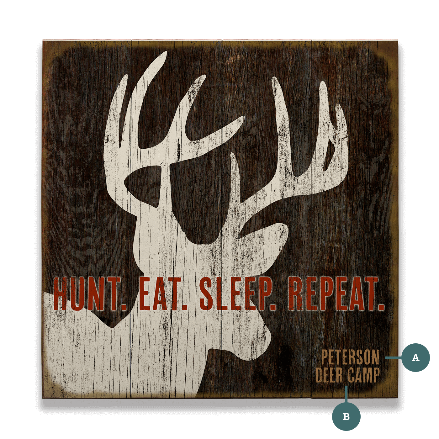 With bold lettering and a crisp silhouette of a trophy buck, this personalized deer camp sign captures the rhythm of hunting season in four simple words: Hunt. Eat. Sleep. Repeat. The distressed background and earthy tones evoke the grit and tradition of time spent in the woods, making it a fitting piece for cabins, lodges, or basements that serve as a seasonal basecamp. Customize the name to give your camp a signature touch—perfect for gift-giving or marking your territory in true outdoorsman style.