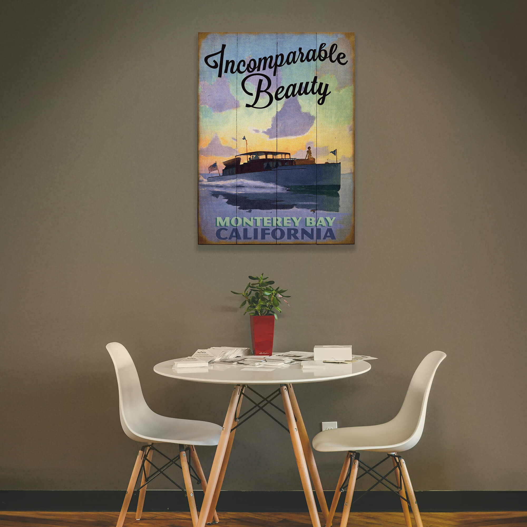 Immerse yourself in the timeless charm of coastal beauty with this "Incomparable Beauty" of a sign. Featuring a serene illustration of a boat gliding through calm waters at sunset, this artwork captures the essence of peaceful maritime adventures. The soft, pastel colors and vintage design make it a captivating addition to any decor, perfect for homes, offices, or businesses seeking to evoke a sense of tranquility and elegance.