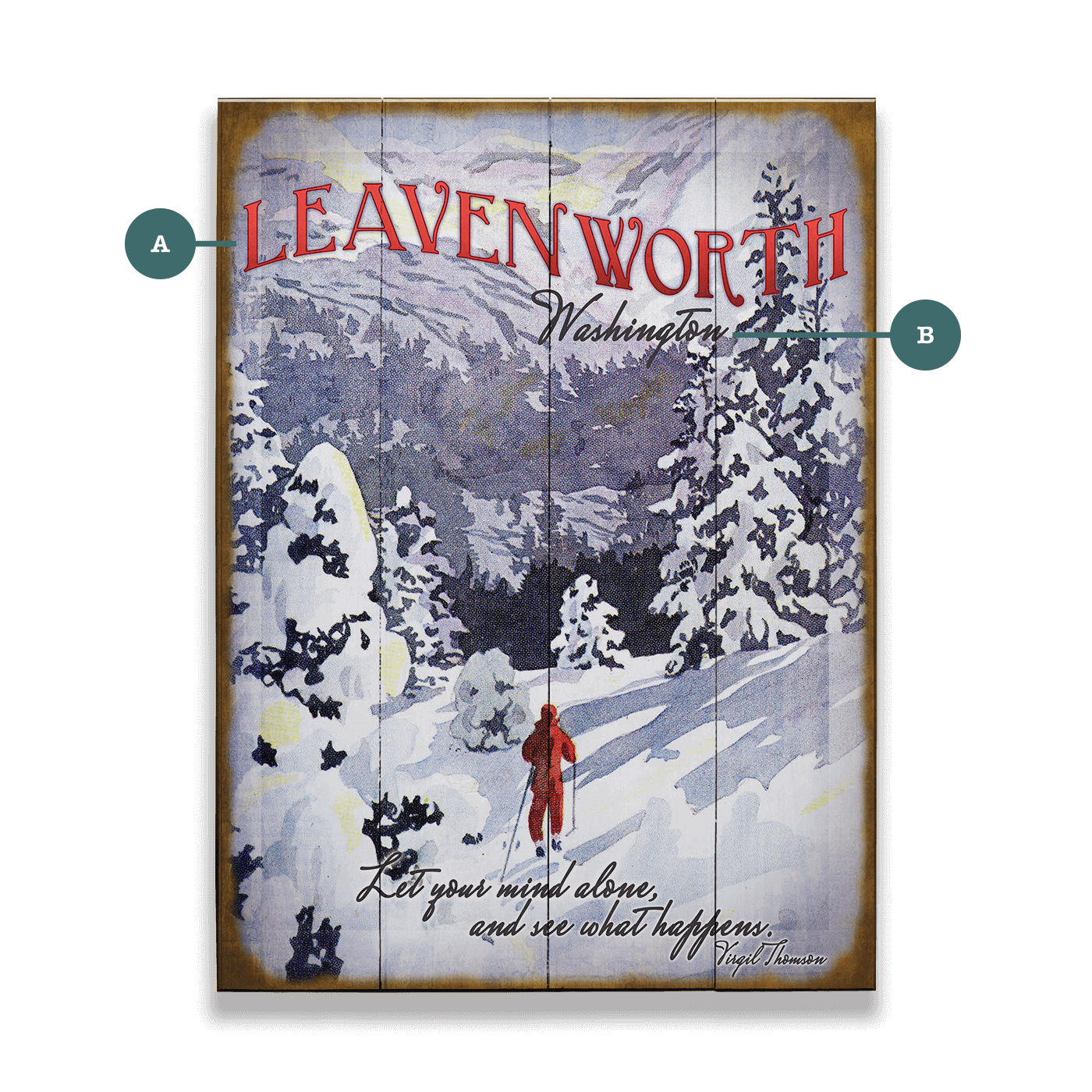 This stunning winter-themed artwork captures the serene beauty of a snow-covered mountain landscape. Featuring a skier in red gliding through a peaceful, snow-laden forest, the piece evokes a sense of adventure and tranquility. The soft, muted colors combined with the detailed illustration create a nostalgic, vintage feel, perfect for lovers of outdoor recreation and winter sports. The artwork’s weathered, retro design adds a timeless charm, making it ideal for decorating spaces with a rustic or alpine theme.