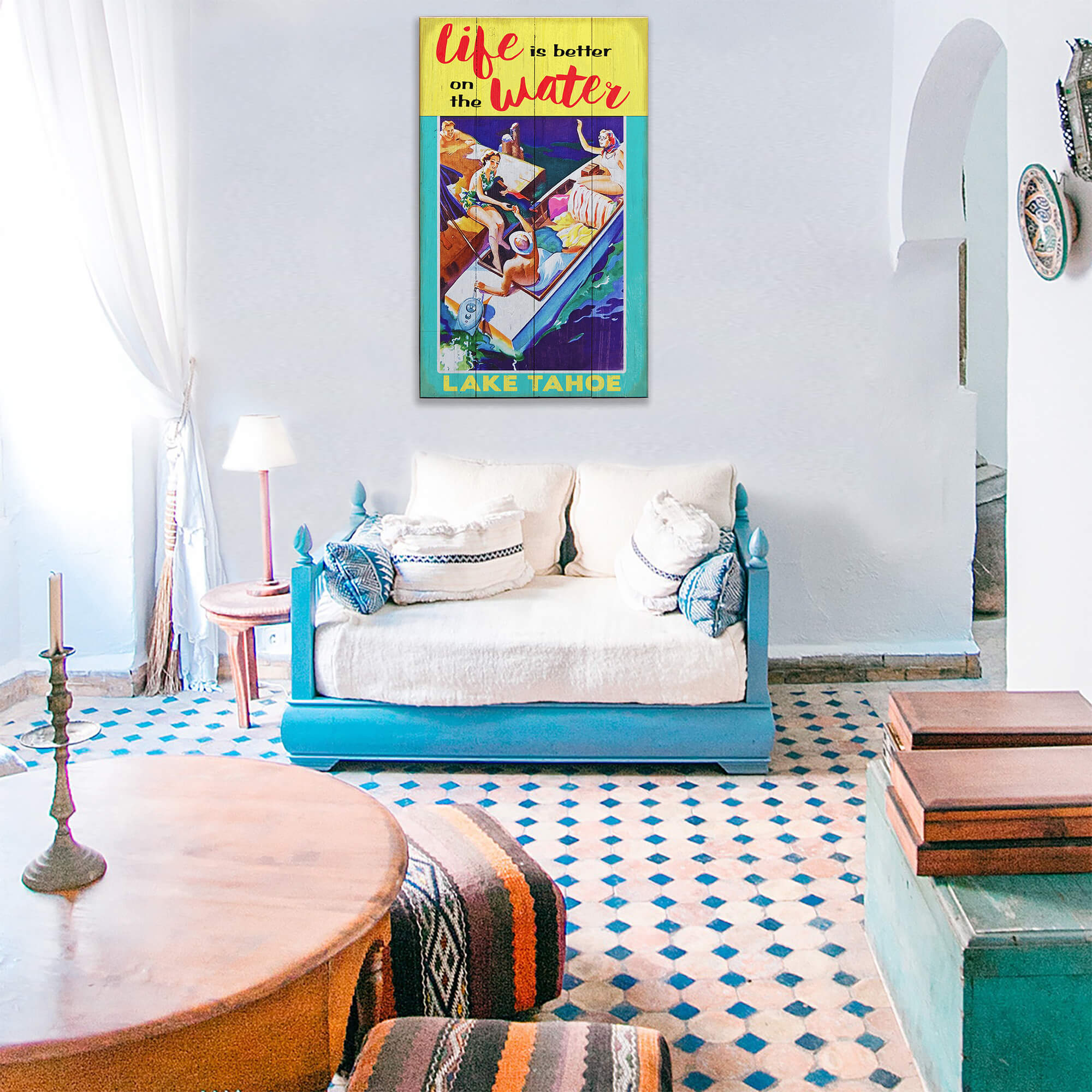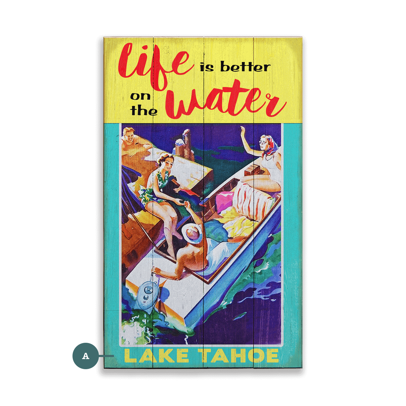 Embrace the joys of lakeside living with our vintage sign that celebrates life on the water! This artwork features a lively scene of friends enjoying a sunny day aboard a boat, perfectly capturing the essence of fun and relaxation. The bright colors and dynamic composition add a playful and inviting touch to any space, reminding us that 'life is better on the water.' Ideal for decorating homes, lake cabins, or as a charming gift for any water enthusiast, this piece is sure to inspire smiles and fond memories.