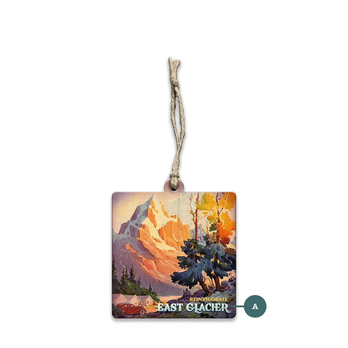 This vibrant, vintage-style artwork highlights the awe-inspiring beauty of East Glacier. Featuring a dramatic mountain peak bathed in warm, golden light, the scene is complemented by charming cottages and a classic car nestled at the foot of the landscape. The rich colors and retro design evoke a sense of tranquility and adventure, perfect for capturing the essence of outdoor exploration. Ideal for nature lovers and fans of nostalgic travel art, this piece adds a touch of timeless charm to any space.
