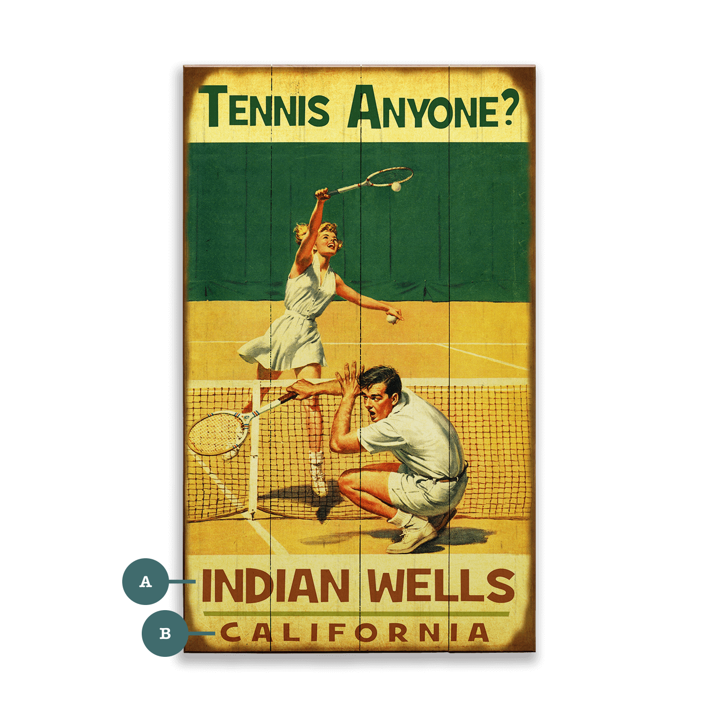 This vintage-inspired artwork captures the excitement of a classic tennis match. Featuring a male and female player mid-action on the court, the piece radiates the fun and energy of the sport. With bold colors and a nostalgic style, it brings a retro flair perfect for tennis lovers and sports enthusiasts. The weathered effect adds a touch of timeless charm, making this artwork an ideal addition to any space that celebrates athletics or classic poster art.