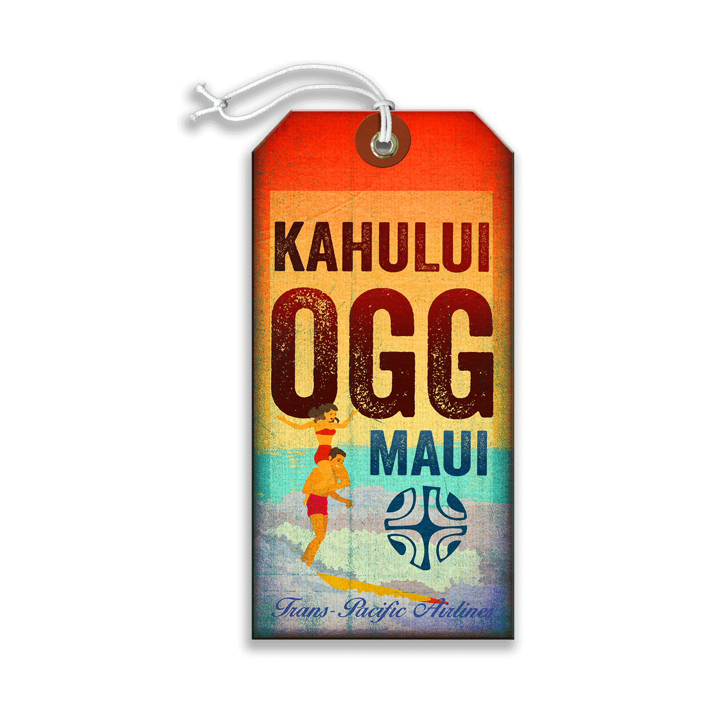 This vintage-style travel tag captures the essence of Maui, showcasing the vibrant spirit and scenic beauty of Kahului (OGG). Featuring a playful depiction of a surfer against a backdrop of sunset hues, this artwork merges retro charm with modern appeal. Perfect for travelers and collectors alike, it celebrates the island's allure and the adventures that await at every corner. Ideal for adding a touch of nostalgic travel flair to your decor!