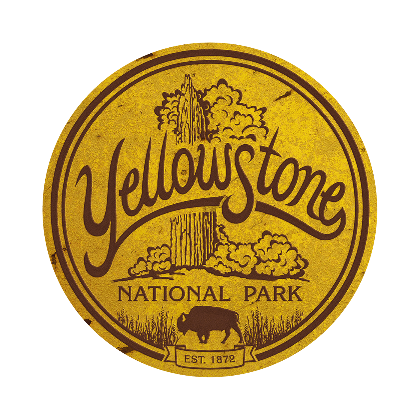 The sign's surface is adorned with the iconic imagery of Yellowstone, including the park's famous geyser and the silhouette of a bison, set against a backdrop of weathered wooden slats that evoke the timeless allure of the great outdoors.