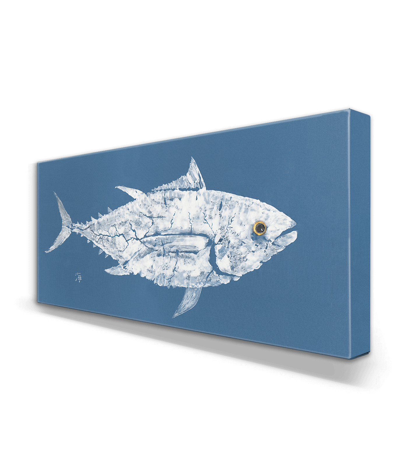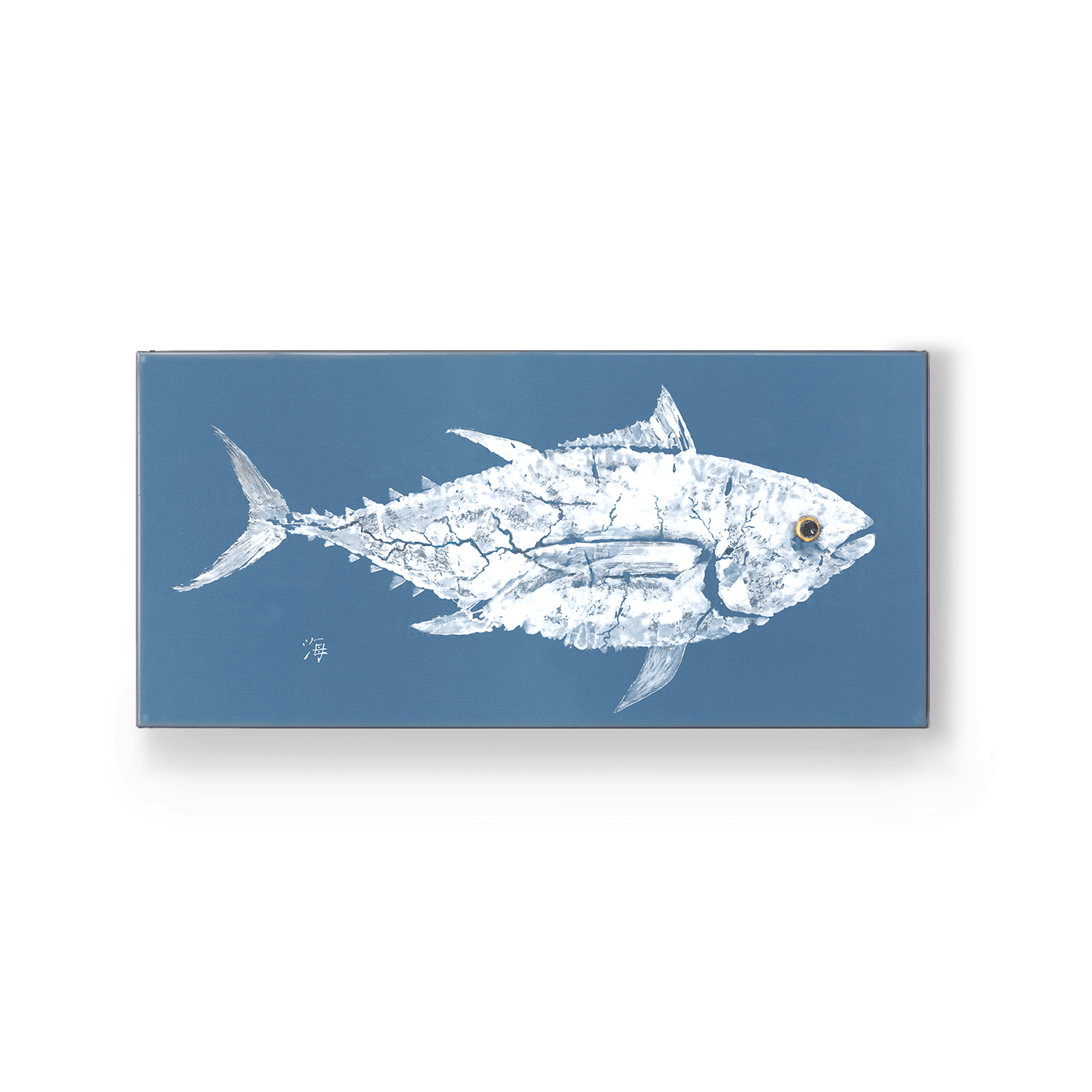 Inspired by traditional Japanese gyotaku printing, this artwork offers a striking depiction of a river tuna—its distinct form captured in bold white against a textured blue background. The natural texture of the fish is preserved through the gyotaku technique, highlighting every ridge, fin, and spine with authentic precision. Ideal for lake houses, cabins, or freshwater-inspired spaces, this piece brings an understated elegance rooted in sportfishing tradition and aquatic appreciation. A perfect fit for collectors, anglers, or anyone who finds peace near inland waterways.